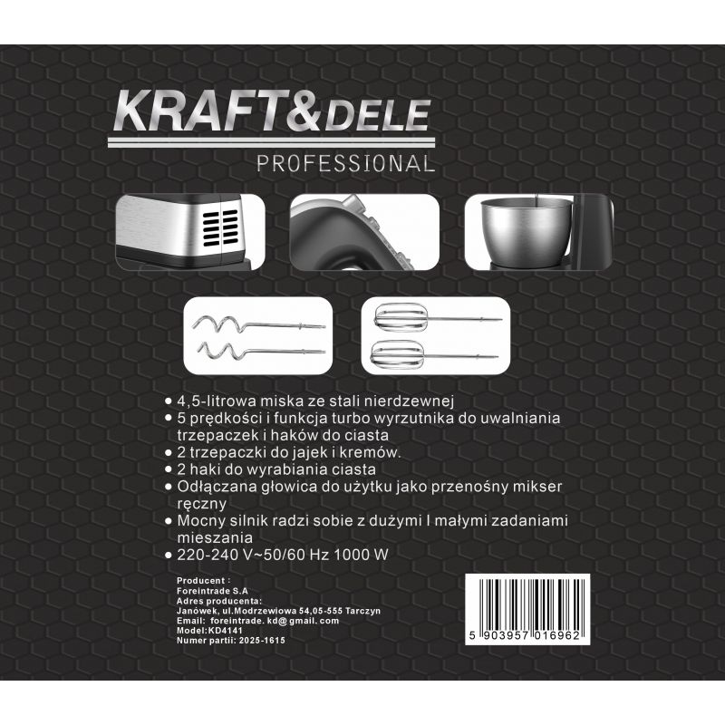 KD4141 to nowoczesny mikser kuchenny marki KRAFT&DELE, zaprojektowany z myślą o wygodzie i wszechstronności w codziennym przygotowywaniu potraw. Dzięki połączeniu funkcji miksera stacjonarnego oraz ręcznego urządzenie doskonale sprawdzi się zarówno podczas przygotowywania lekkich kremów, jak i ciężkich ciast.