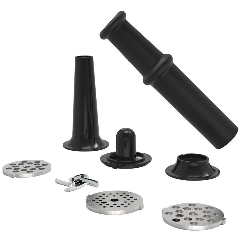 Model KD4143 został wyposażony w dwa noże tnące – klasyczny pojedynczy oraz podwójny, który zapewnia szybsze i bardziej równomierne mielenie, szczególnie przy twardszych kawałkach mięsa. W zestawie znajdują się trzy metalowe sitka o średnicy 54 mm (3 mm, 5 mm, 7 mm), pozwalające dobrać odpowiednią strukturę mielonego produktu.