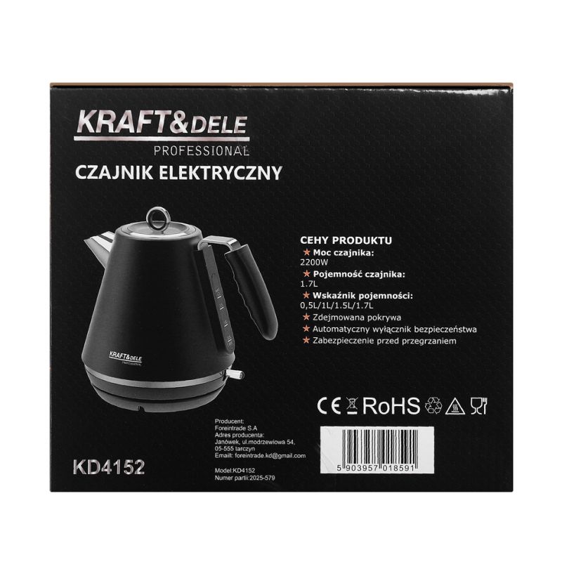 Czajnik elektryczny KRAFT&DELE KD4152 pozwala szybko zagotować wodę w komfortowy i bezpieczny sposób. Dzięki pojemności 1,7L idealnie sprawdzi się w każdym domu lub biurze, a czytelny wskaźnik poziomu wody umożliwia precyzyjne odmierzenie potrzebnej ilości.