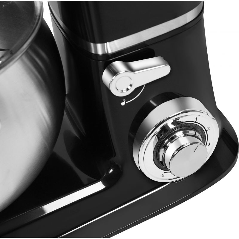 Funkcja maszynki do mięsa pozwala w łatwy sposób przygotować świeże mielone mięso, natomiast blender szklany 1,5L idealnie sprawdza się do koktajli, zup kremów i sosów. Głowica uchylna ułatwia wyjmowanie miski, a odłączalne końcówki – hak do ciasta, mieszadło płaskie i trzepaczka ze stali nierdzewnej – zwiększają uniwersalność urządzenia. Regulacja 6 prędkości zapewnia pełną kontrolę nad procesem mieszania. Stabilność gwarantują 4 antypoślizgowe przyssawki.