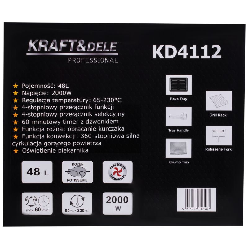 Model KD4112 wyposażony został w intuicyjny panel sterowania z czterema pokrętłami: regulacją temperatury, wyborem funkcji, przełącznikiem selekcyjnym oraz timerem z alarmem. Timer umożliwia ustawienie czasu pracy do 60 minut i automatyczne wyłączenie po jego upływie, co zapewnia bezpieczeństwo użytkowania oraz komfort podczas przygotowywania potraw.