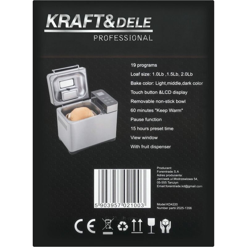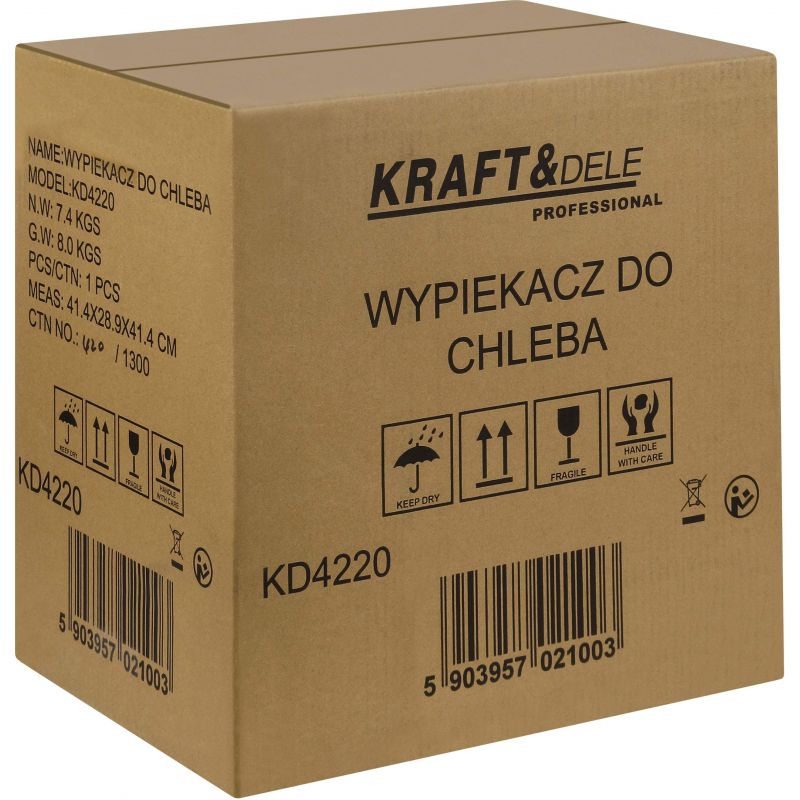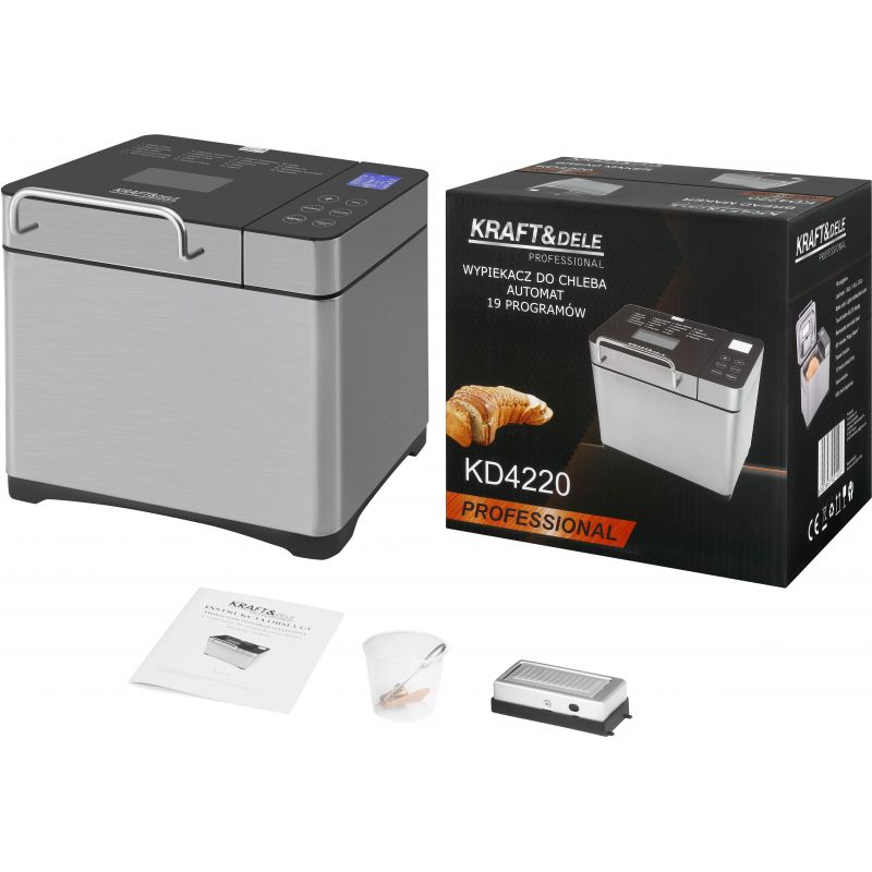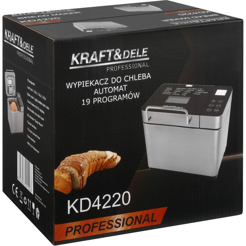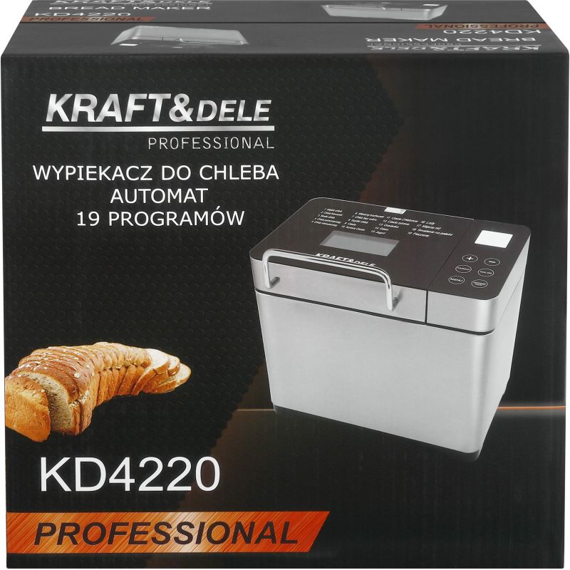 KD4220 to nowoczesny wypiekacz do chleba marki KRAFT&DELE, przeznaczony do automatycznego przygotowywania domowego pieczywa oraz wielu innych potraw. Urządzenie pozwala na wygodne pieczenie chleba o różnych smakach, a także przygotowywanie ciasta, dżemu, jogurtu, lodów czy ryżu, dzięki czemu doskonale sprawdzi się w każdej kuchni.