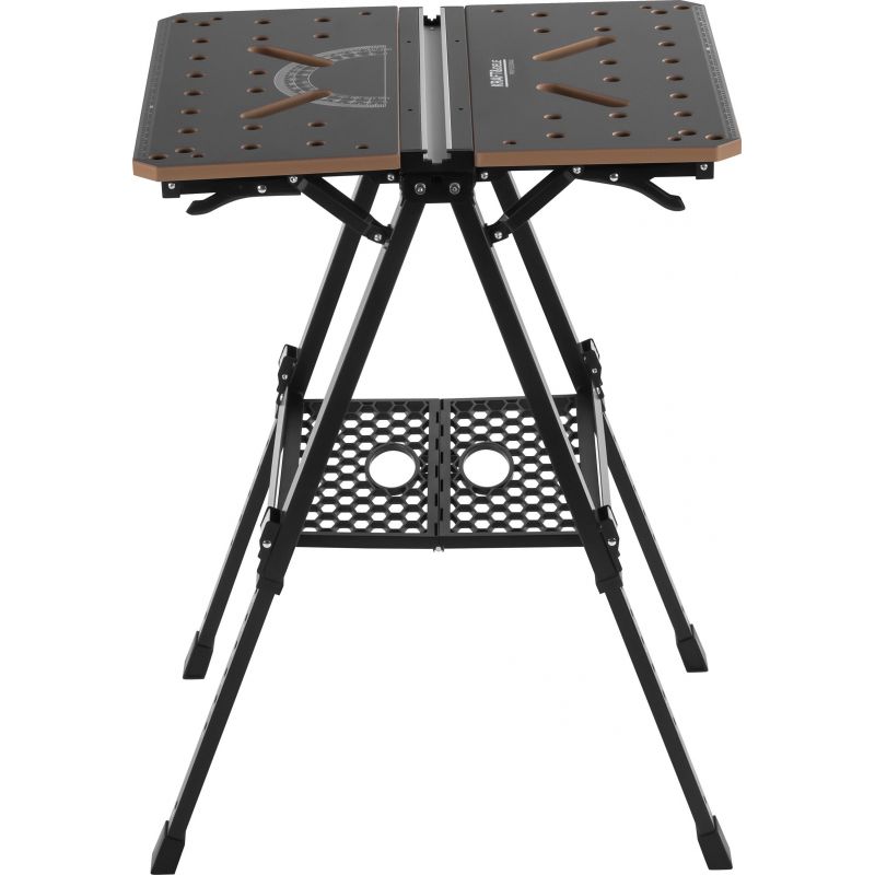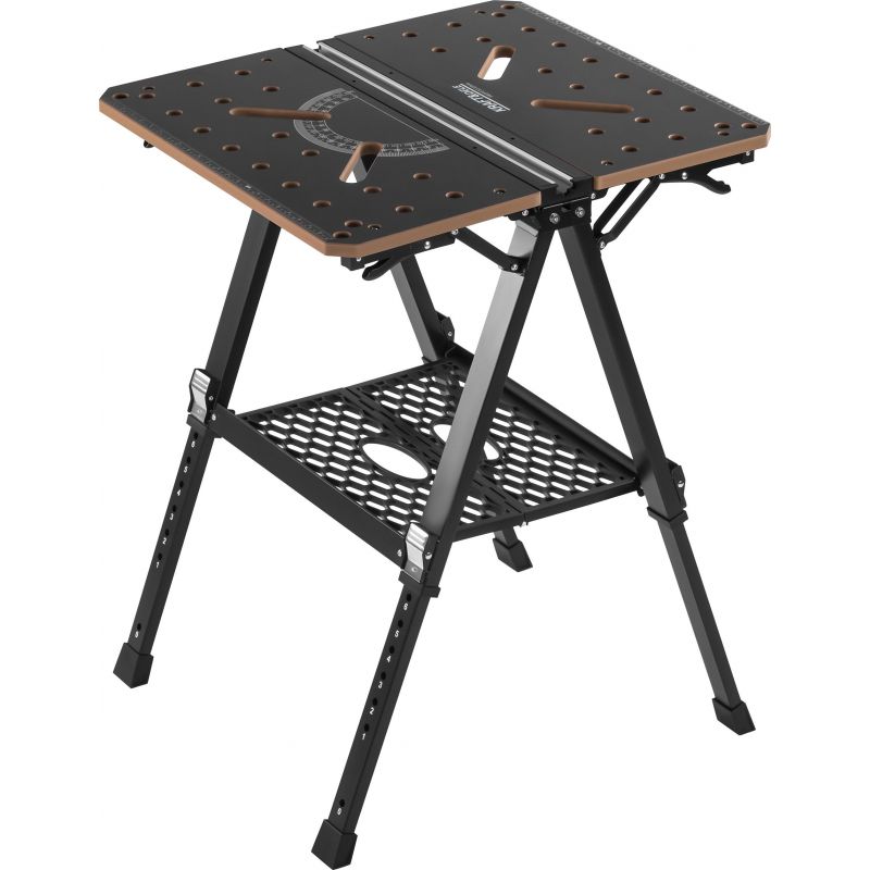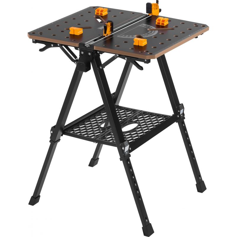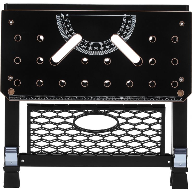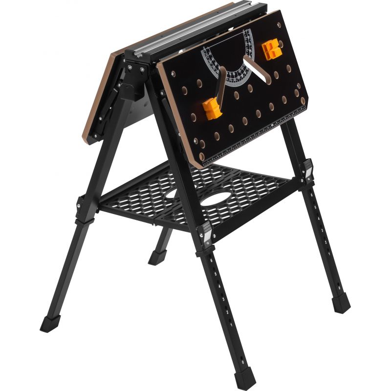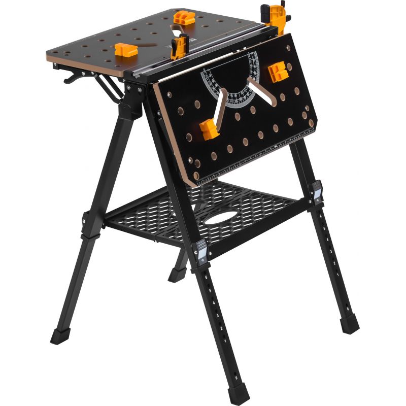 Blat wykonany z wytrzymałej płyty MDF o grubości 18 mm oraz stalowe nogi zapewniają solidną podstawę do pracy, a nośność do 454 kg pozwala bezpiecznie obsługiwać cięższe narzędzia i elementy. System otworów montażowych umożliwia mocowanie w pionie i w poziomie, a dołączony szybki zacisk oraz psy zaciskowe pozwalają stabilnie unieruchomić materiał. Stół posiada 7-stopniową regulację wysokości w zakresie 60–92 cm, co ułatwia dopasowanie pozycji do pracy stojącej lub siedzącej. Dodatkowo możliwość łączenia kilku stołów oraz zastosowania jako konika piłowego daje większą swobodę podczas pracy z długimi elementami.