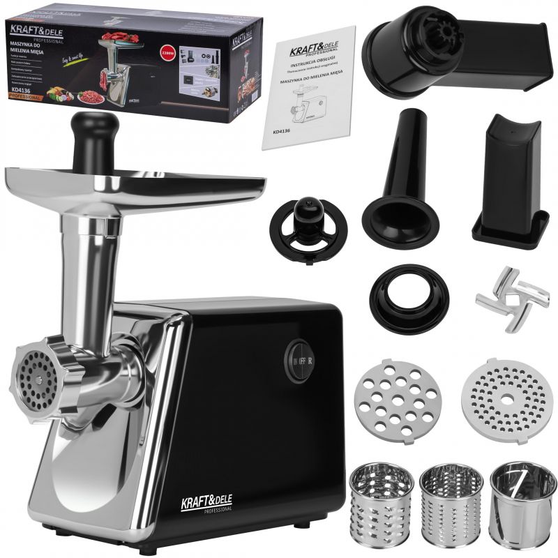Maszynka do mielenia mięsa | Moc nominalna 800W | Szatkownica z 4 rodzajami ostrzy | 3 dyski do mielenia | 2 ostrza tnące | Metalowa taca | Tryb wsteczny | 2 moce pracy | Akcesoria masarskie | Schowek na akcesoria | Antypoślizgowe nóżki | Zabezpieczenie przed przegrzaniem