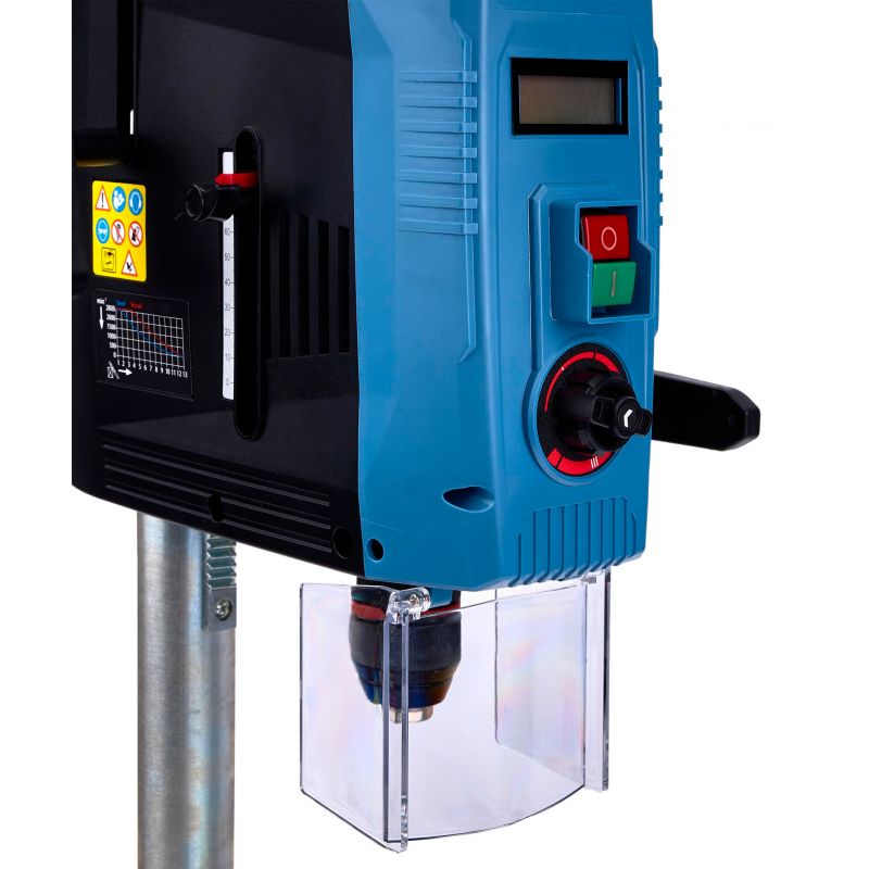 Wiertarka wyposażona jest w podświetlany wyświetlacz ciekłokrystaliczny LCD na którym pokazują się informacji o ilościach obrotów oraz pozycji głębokości wiercenia.