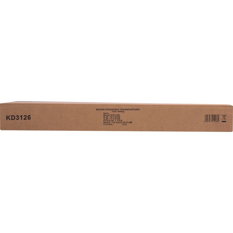 Model KD3126 wyposażony został w pojemną skrzynię o objętości 125 litrów, która pozwala na przewożenie różnego rodzaju materiałów, takich jak drewno, kamienie czy narzędzia. Solidna stalowa konstrukcja w połączeniu z wytrzymałym tworzywem zapewnia trwałość i odporność na intensywne użytkowanie. Cztery koła umożliwiają stabilne prowadzenie nawet na nierównym terenie, a funkcja kiprowania pozwala na szybki i wygodny rozładunek bez zbędnego wysiłku. Wózek został również wyposażony w wygodny, ergonomiczny uchwyt, który zapewnia pewny chwyt oraz lepszą kontrolę podczas prowadzenia, nawet przy maksymalnym obciążeniu.