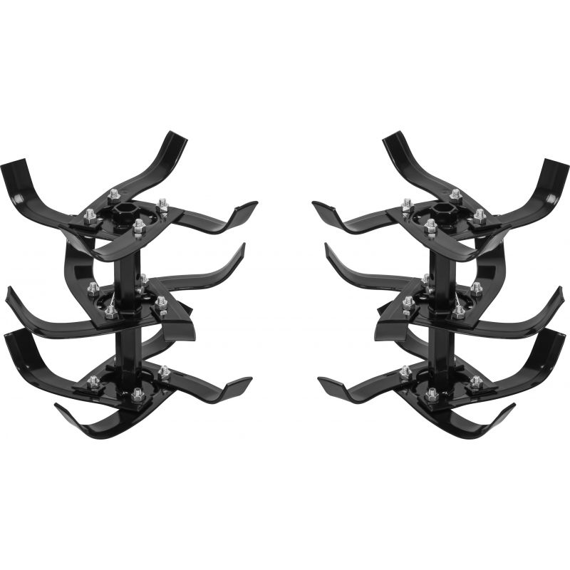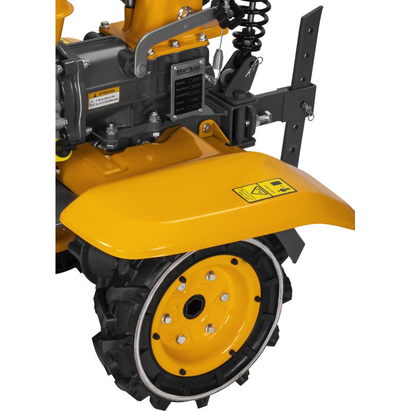 Model KD5186 został wyposażony w dodatkowe elementy zwiększające funkcjonalność oraz bezpieczeństwo użytkowania. Błotniki chronią operatora przed wyrzucaną ziemią, metalowe tarcze ochronne zabezpieczają ostrza podczas pracy, a stalowy wspornik zapewnia stabilność urządzenia podczas postoju. W zestawie znajduje się również wyorywacz oraz pług umożliwiające wykonywanie dodatkowych prac w ogrodzie.