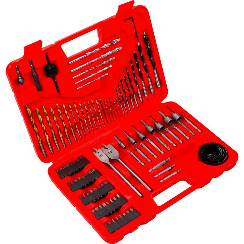 W skład zestawu wchodzą wiertła do metalu, betonu i drewna, a także bogaty komplet bitów, nasadek i akcesoriów pomocniczych. Zestaw umożliwia wiercenie, wkręcanie oraz wykonywanie otworów w różnych materiałach. Całość została zapakowana w praktyczną walizkę z tworzywa sztucznego, która zapewnia wygodne przechowywanie oraz łatwy transport wszystkich elementów.