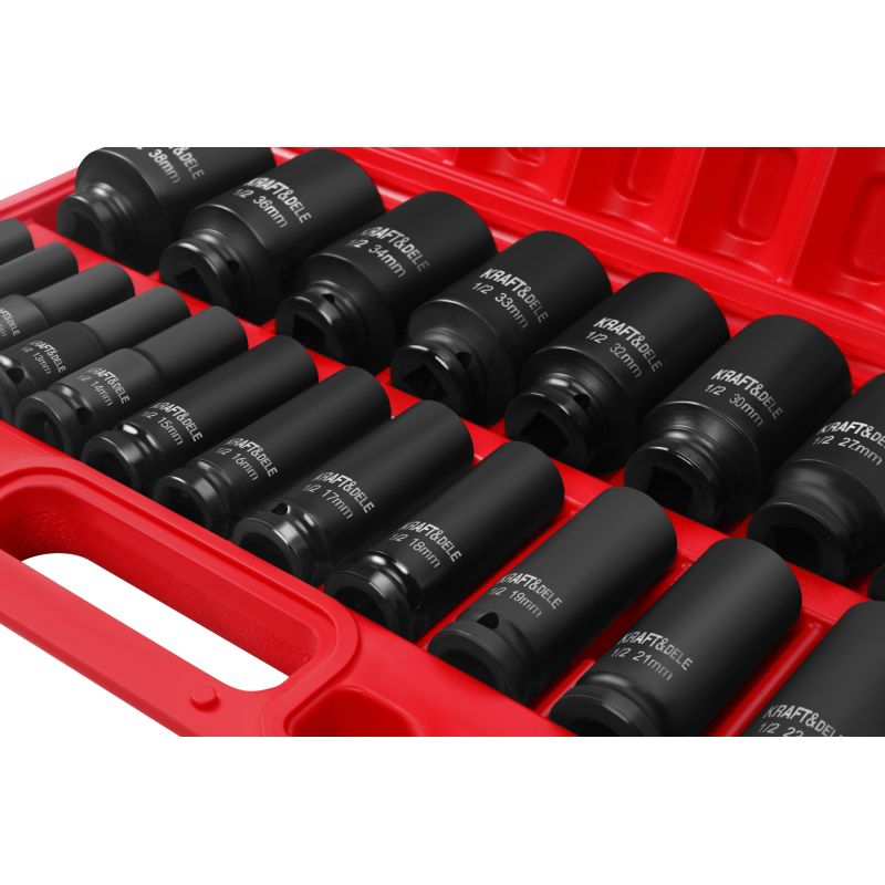 Dzięki zastosowaniu uchwytu 1/2”, zestaw jest kompatybilny z większością popularnych kluczy udarowych. Dokładnie dobrany zakres rozmiarów od 10 mm do 38 mm pozwala na wszechstronne użycie — od prac przy zawieszeniu, poprzez demontaż elementów silnika, po serwis kół. Całość umieszczona jest w solidnej walizce, która zapewnia bezpieczne przechowywanie oraz wygodny transport.