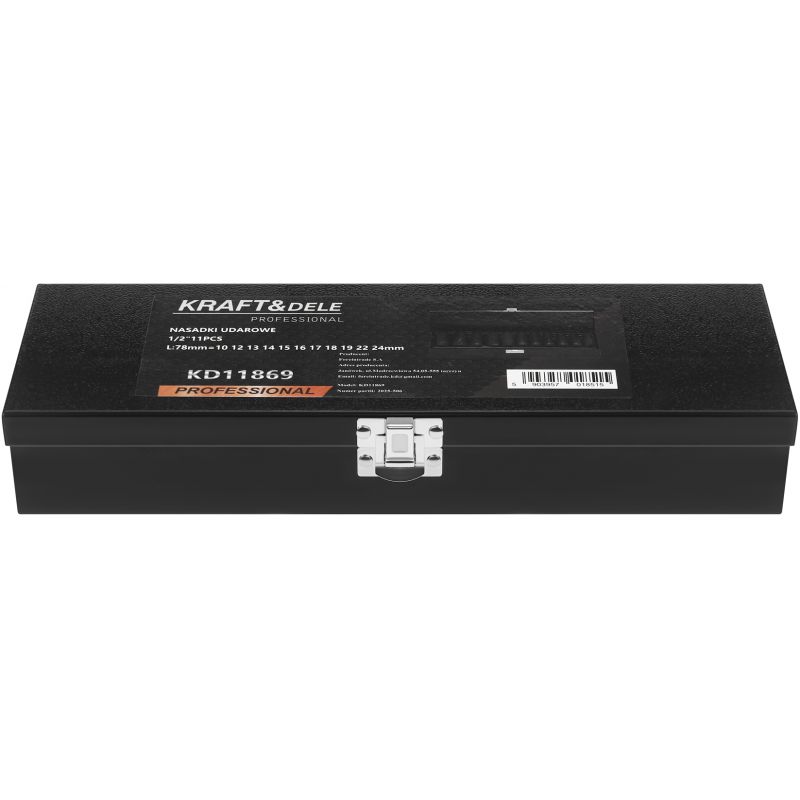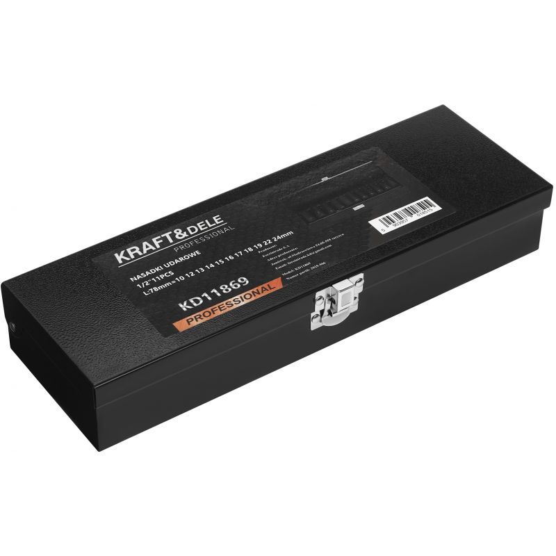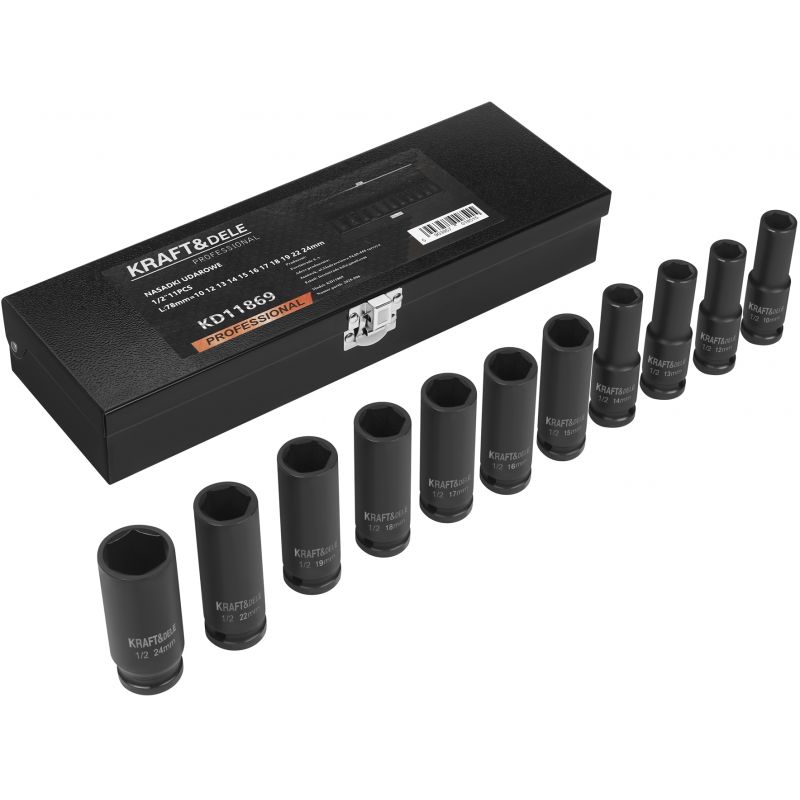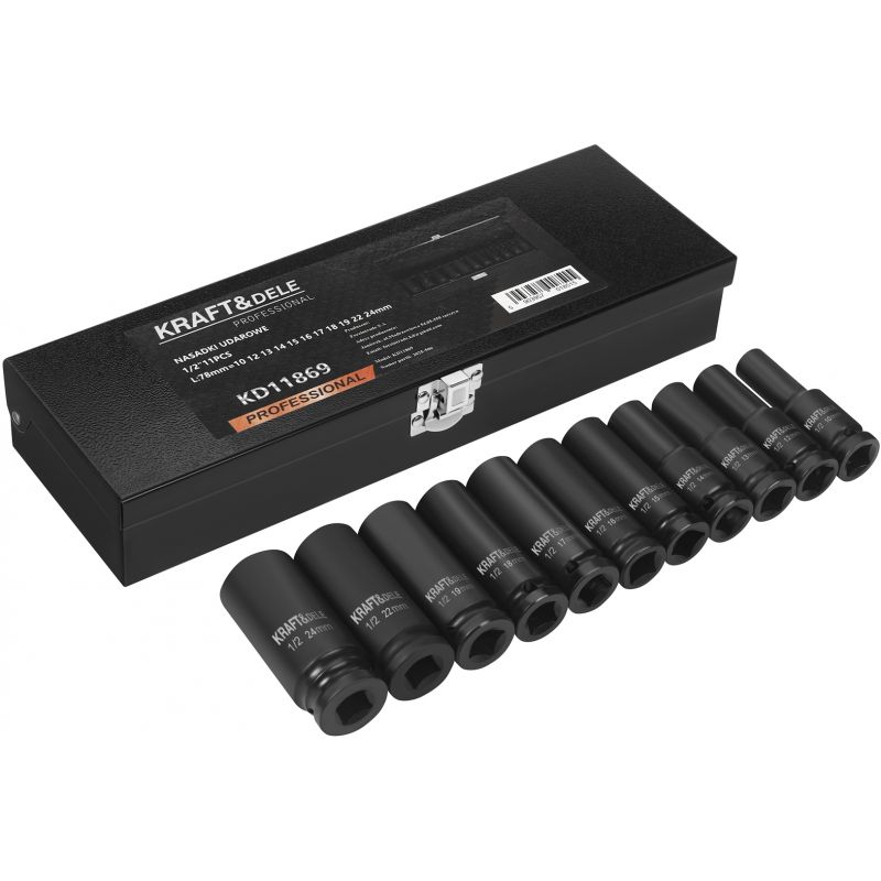 Długość każdej nasadki wynosząca 78 mm zapewnia wygodę pracy w trudno dostępnych miejscach, a solidna walizka metalowa pozwala na bezpieczne przechowywanie całego kompletu. KD11869 to praktyczny zestaw dla osób ceniących niezawodność, trwałość i pełną kompatybilność z popularnym mocowaniem 1/2”.