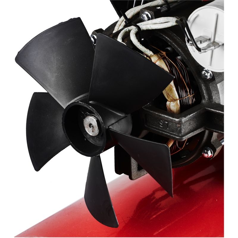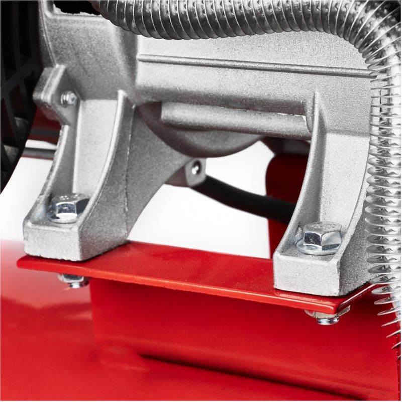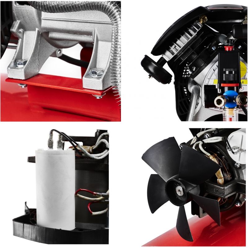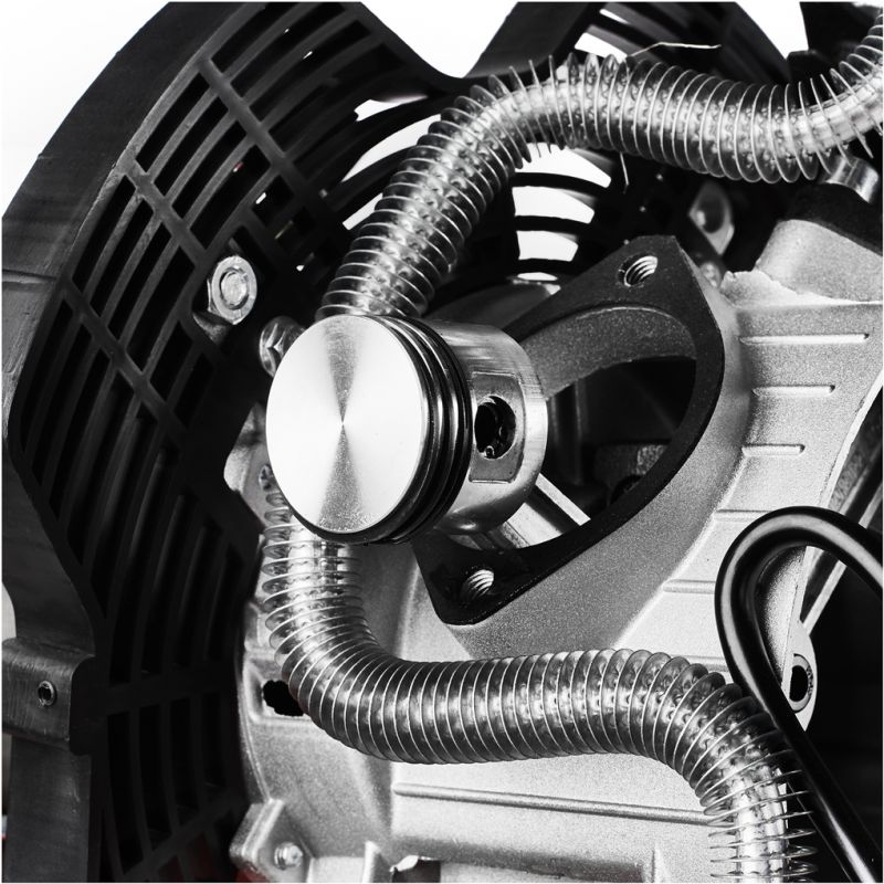 Sprężarka została wyposażona w mocny silnik dwutłokowy o mocy 4 KM, który zapewnia wysoką wydajność zasysania oraz efektywną pracę z szeroką gamą narzędzi pneumatycznych. Zastosowanie separatora umożliwia zatrzymanie oleju i wody w wydmuchiwanym powietrzu, co przekłada się na czystszą i bardziej stabilną pracę. Powiększona średnica przepływu powietrza ogranicza ryzyko blokowania się nieczystości, a solidna konstrukcja oraz skuteczne chłodzenie powietrzem pozwalają na długotrwałą i bezpieczną eksploatację.