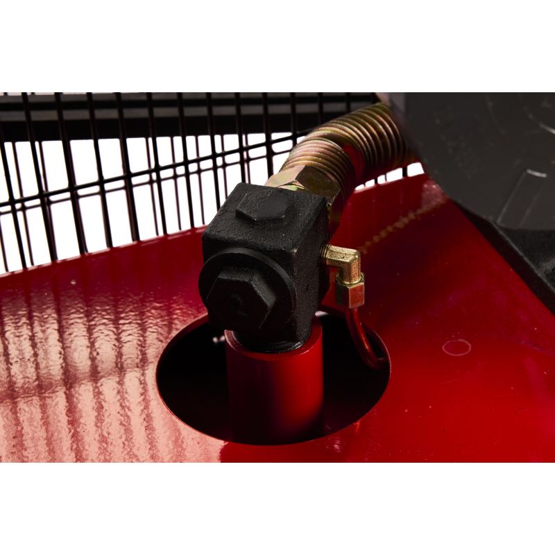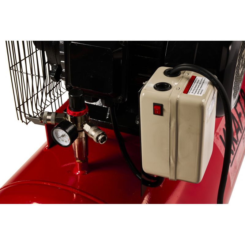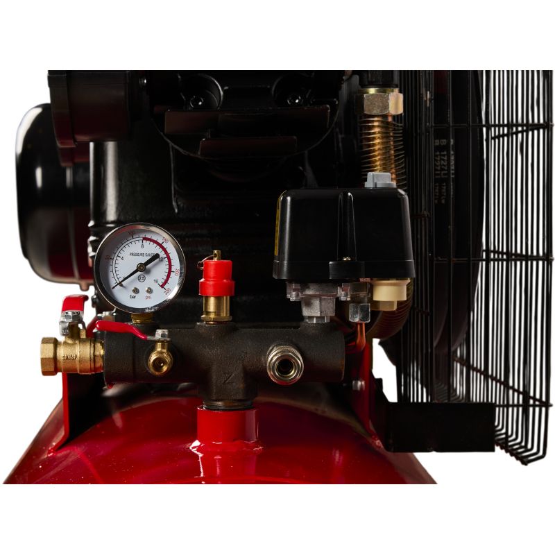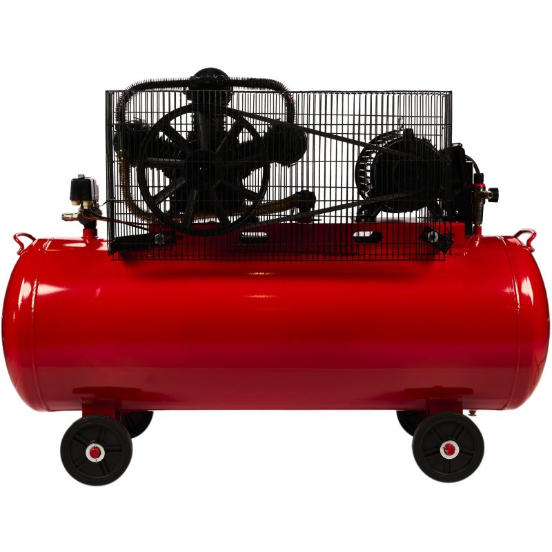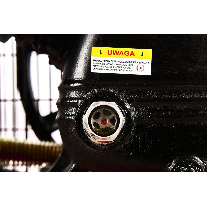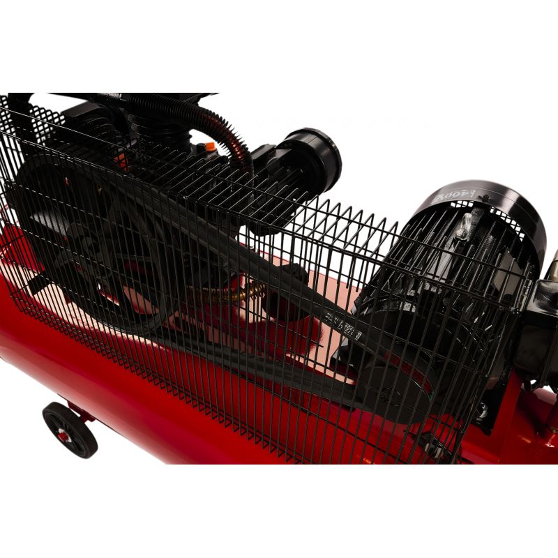 Sprężarka posiada napęd paskowy, silnik indukcyjny oraz smarowanie olejowe, co przekłada się na trwałość i przystosowanie do długotrwałej pracy. Wbudowany separator z reduktorem ciśnienia zatrzymuje wodę i olej w wydmuchiwanym powietrzu, a możliwość regulacji ciśnienia na wyjściu zwiększa kontrolę nad parametrami pracy. Szerokie ożebrowanie wspiera skuteczne chłodzenie powietrzem, a solidne kółka ułatwiają transport urządzenia.
