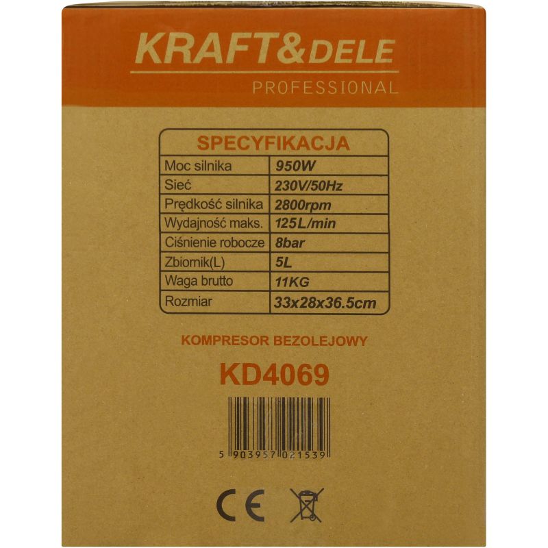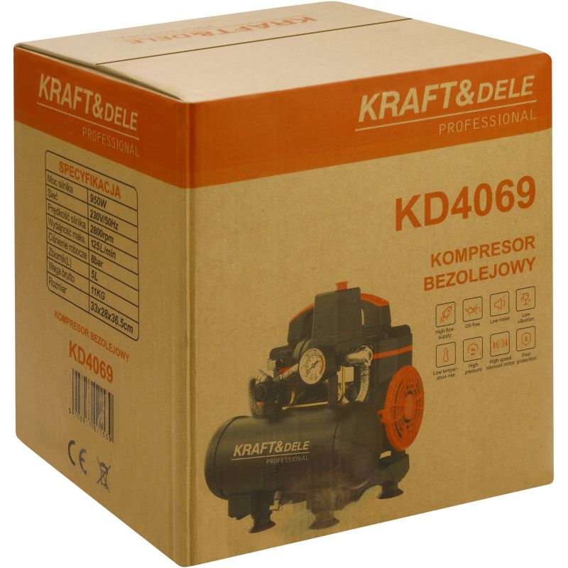Model KD4069 wyposażony jest w wydajny silnik o mocy 950W oraz zbiornik o pojemności 5 litrów. Kompresor osiąga wydajność do 125 l/min i ciśnienie robocze 8 bar, co pozwala na efektywną pracę w różnych zastosowaniach. Urządzenie posiada manometr do kontroli ciśnienia, szybkozłącze oraz zabezpieczenie przeciążeniowe w postaci przycisku reset. Stabilna konstrukcja z gumowymi stopkami oraz wygodny uchwyt transportowy zapewniają komfort użytkowania i łatwość przenoszenia.