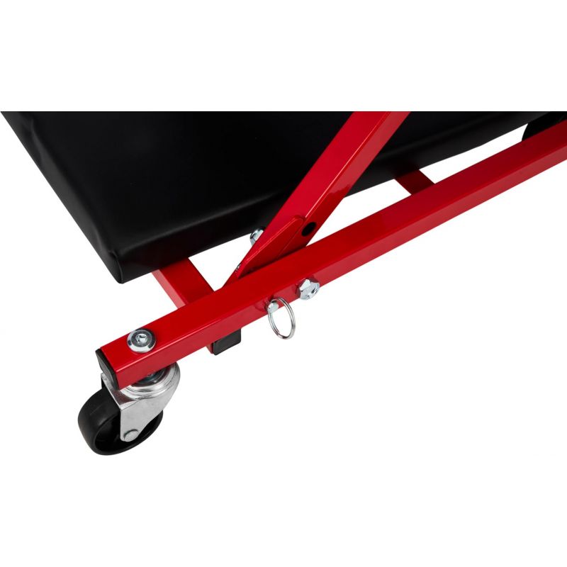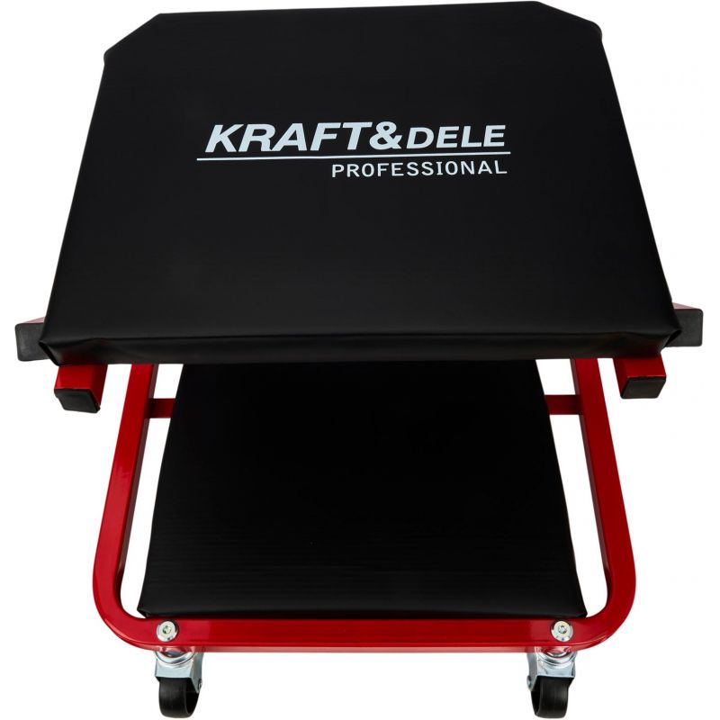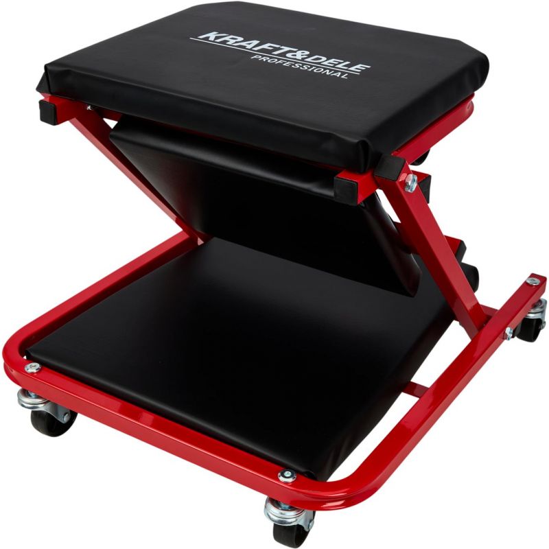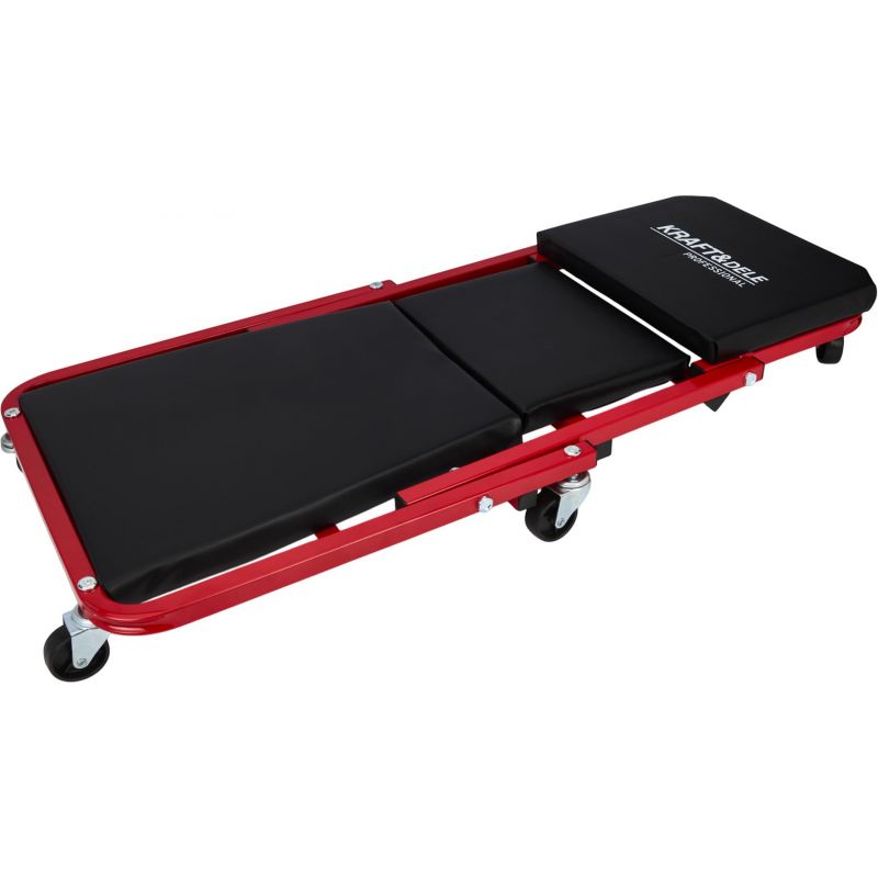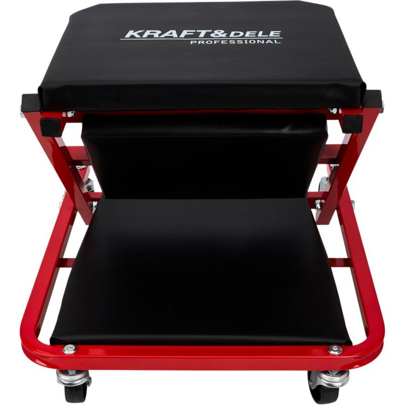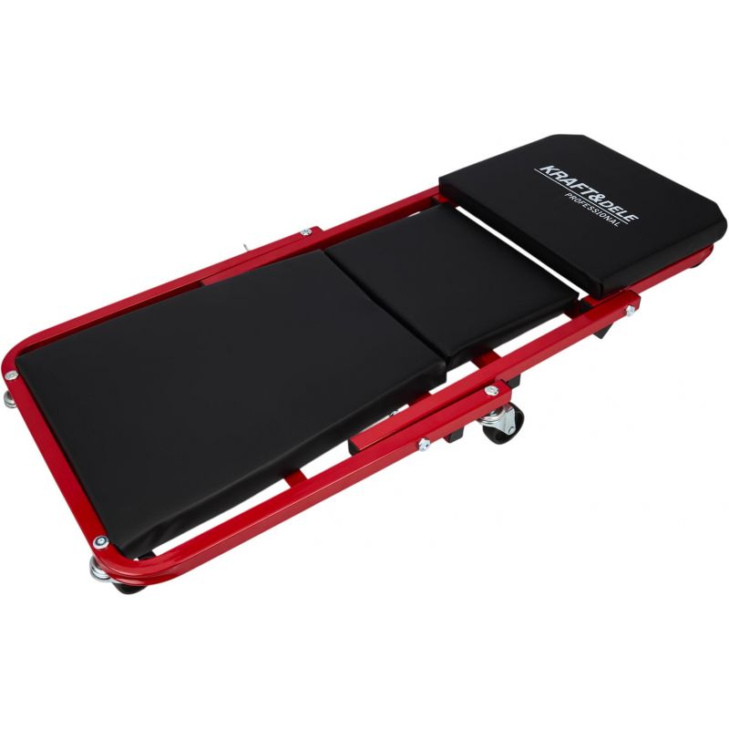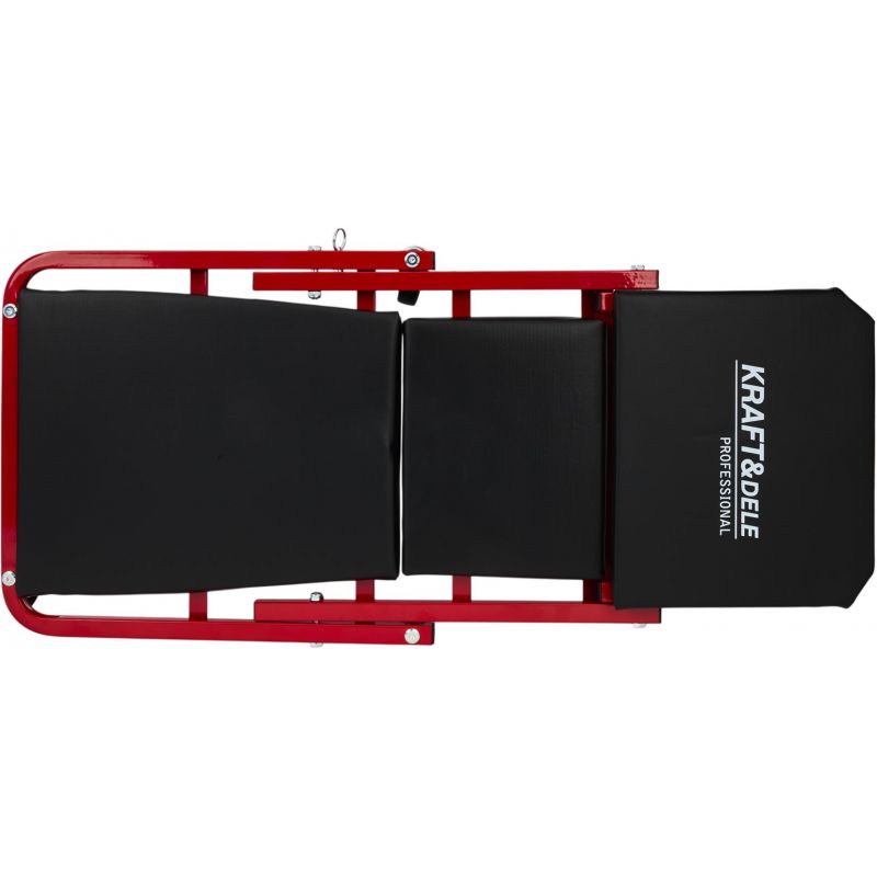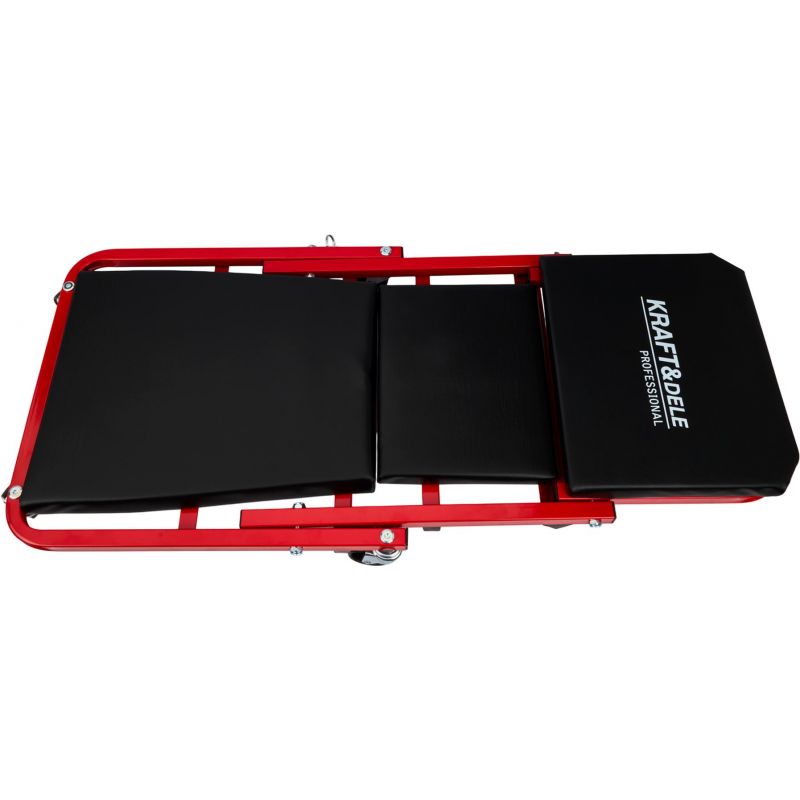 Model KD10764 może być używany w pozycji leżącej jako klasyczna leżanka warsztatowa lub – po szybkim złożeniu – jako wygodne siedzisko warsztatowe. Solidny metalowy stelaż gwarantuje trwałość i odporność na zginanie oraz uderzenia, a miękkie siedzisko obite ekoskórą zwiększa wygodę użytkowania. Leżanka wyposażona została w 6 skrętnych kółek o średnicy 50 mm, które ułatwiają manewrowanie pod pojazdem. Dodatkowa blokada zabezpiecza przed przypadkowym rozłożeniem.