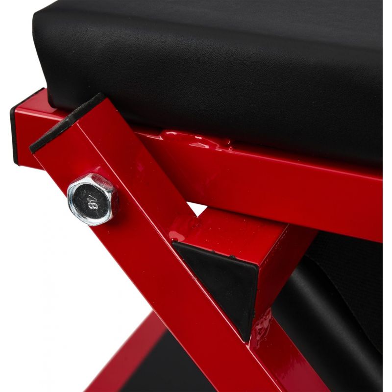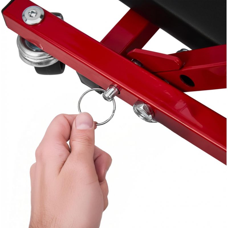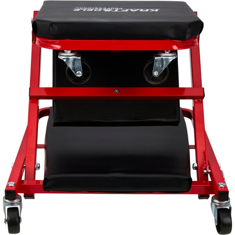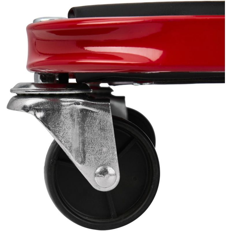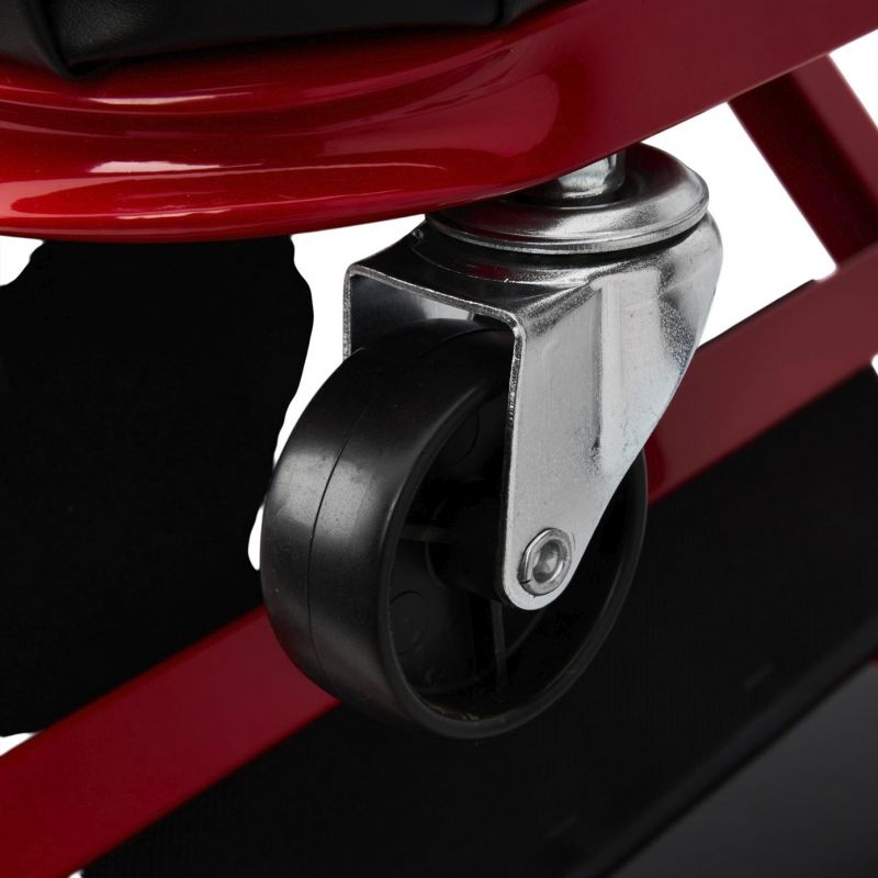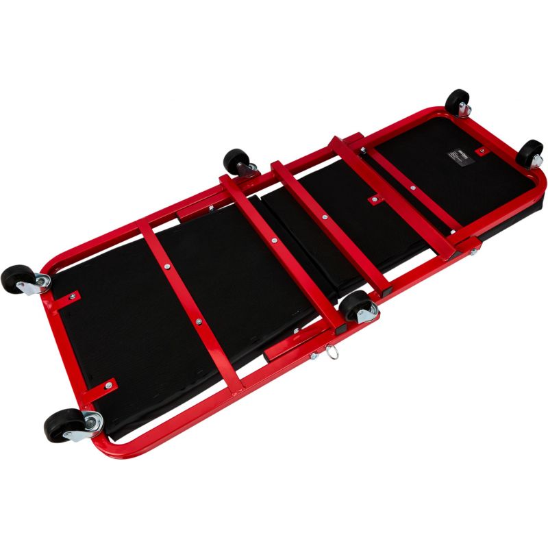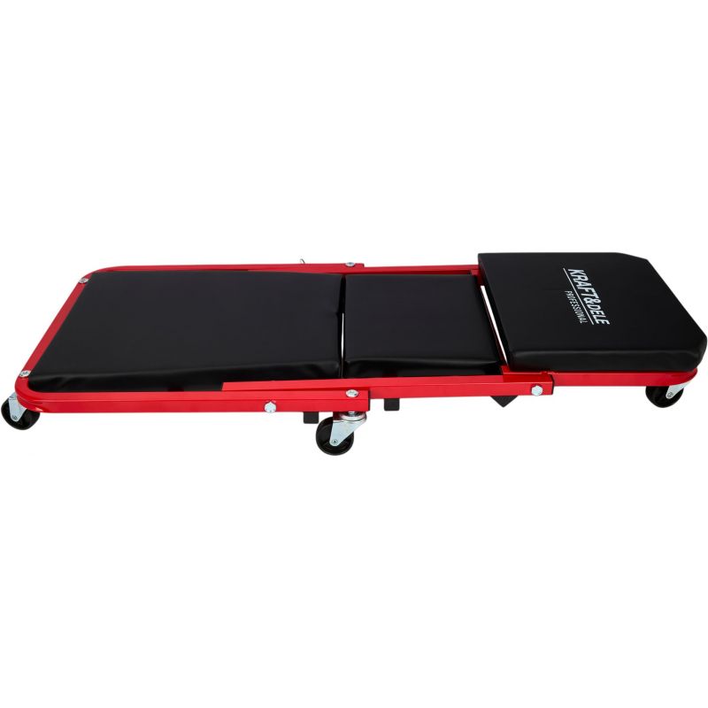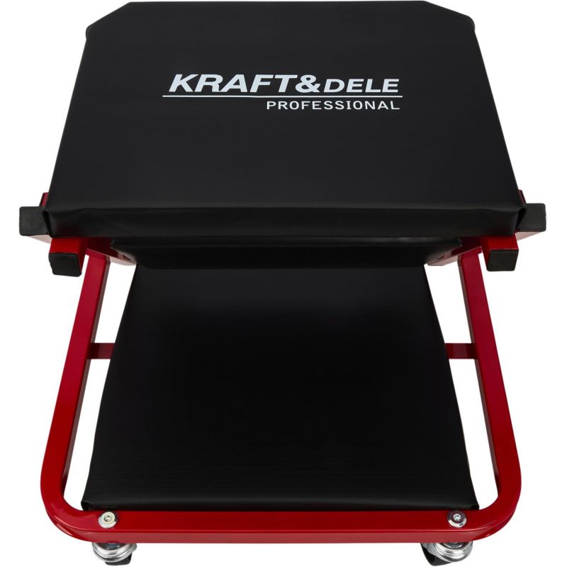 Model KD10764 może być używany w pozycji leżącej jako klasyczna leżanka warsztatowa lub – po szybkim złożeniu – jako wygodne siedzisko warsztatowe. Solidny metalowy stelaż gwarantuje trwałość i odporność na zginanie oraz uderzenia, a miękkie siedzisko obite ekoskórą zwiększa wygodę użytkowania. Leżanka wyposażona została w 6 skrętnych kółek o średnicy 50 mm, które ułatwiają manewrowanie pod pojazdem. Dodatkowa blokada zabezpiecza przed przypadkowym rozłożeniem.