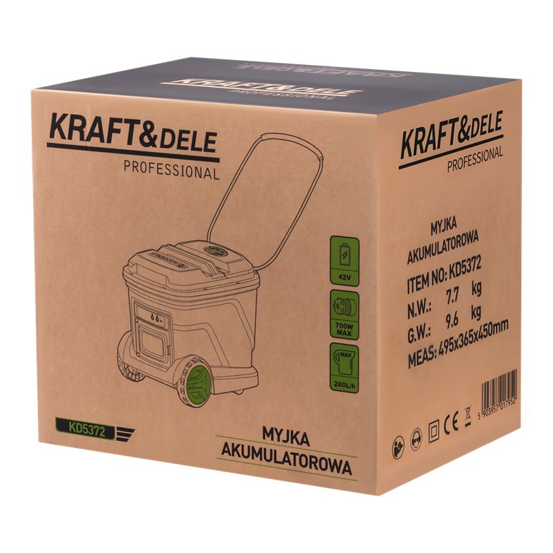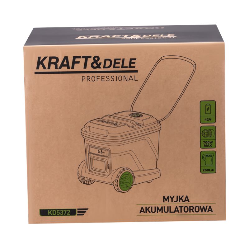 KD5372 to przenośna, akumulatorowa myjka ciśnieniowa marki KRAFT&DELE, zaprojektowana do wygodnego czyszczenia wszędzie tam, gdzie nie ma dostępu do sieci wodnej ani elektrycznej. Dzięki dużemu zbiornikowi o pojemności 20 litrów, urządzenie oferuje pełną niezależność i mobilność podczas pracy.