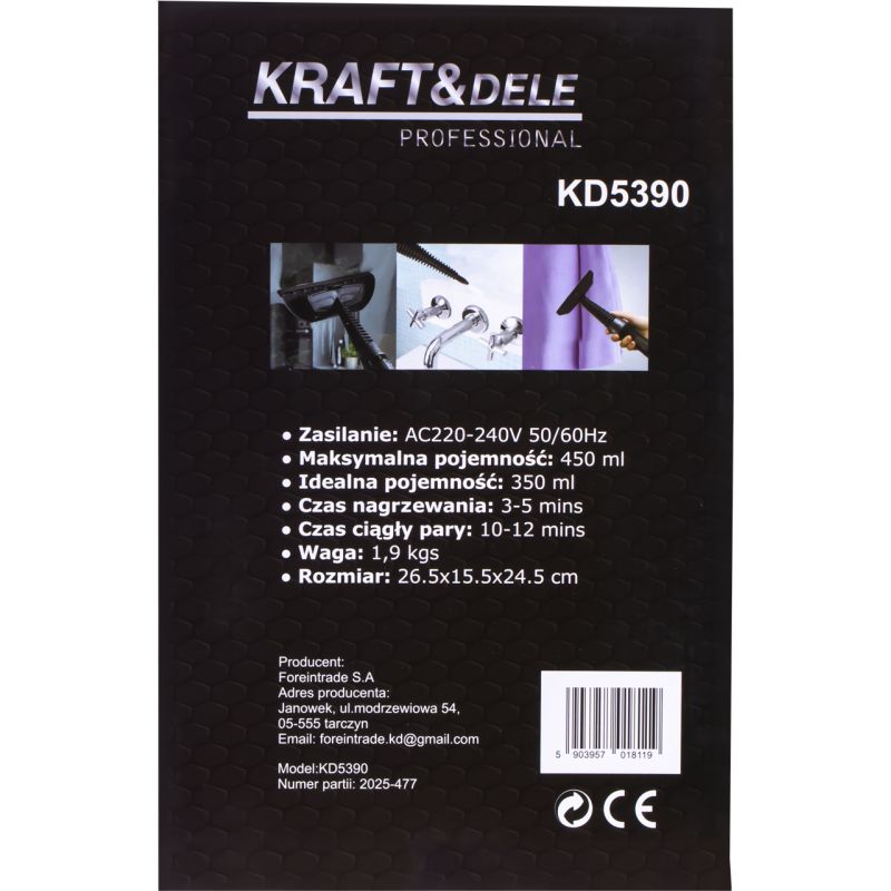 KD5390 to kompaktowa i wydajna myjka parowa marki KRAFT&DELE, przeznaczona do czyszczenia różnego rodzaju powierzchni za pomocą gorącej pary wodnej. Urządzenie doskonale usuwa zabrudzenia, tłuszcz, bakterie i wirusy bez użycia detergentów – jedynie za pomocą siły pary. Idealnie sprawdzi się w domu, warsztacie, kuchni, łazience, samochodzie czy przy czyszczeniu tapicerki.