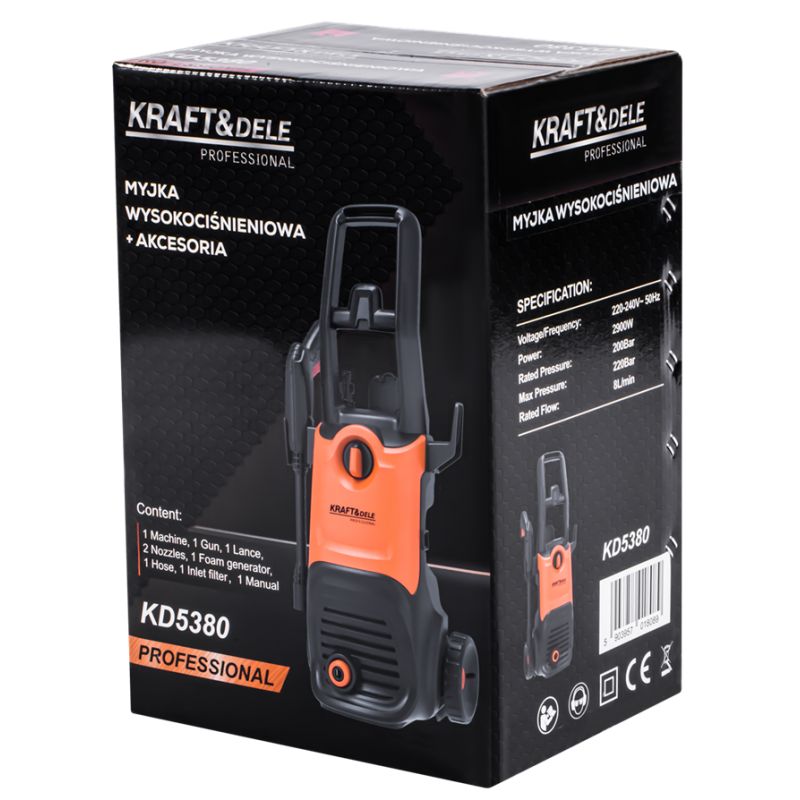 Model KD5380 to profesjonalna myjka wysokociśnieniowa o dużej mocy 2900W, przeznaczona do szybkiego i skutecznego czyszczenia samochodów, tarasów, elewacji i innych powierzchni. Urządzenie łączy wysokie ciśnienie robocze z funkcjonalnością i bezpieczeństwem użytkowania, a przemyślana konstrukcja ułatwia transport i pracę w terenie.