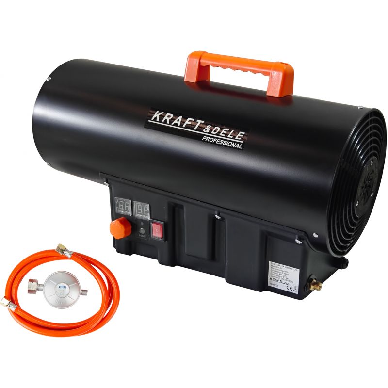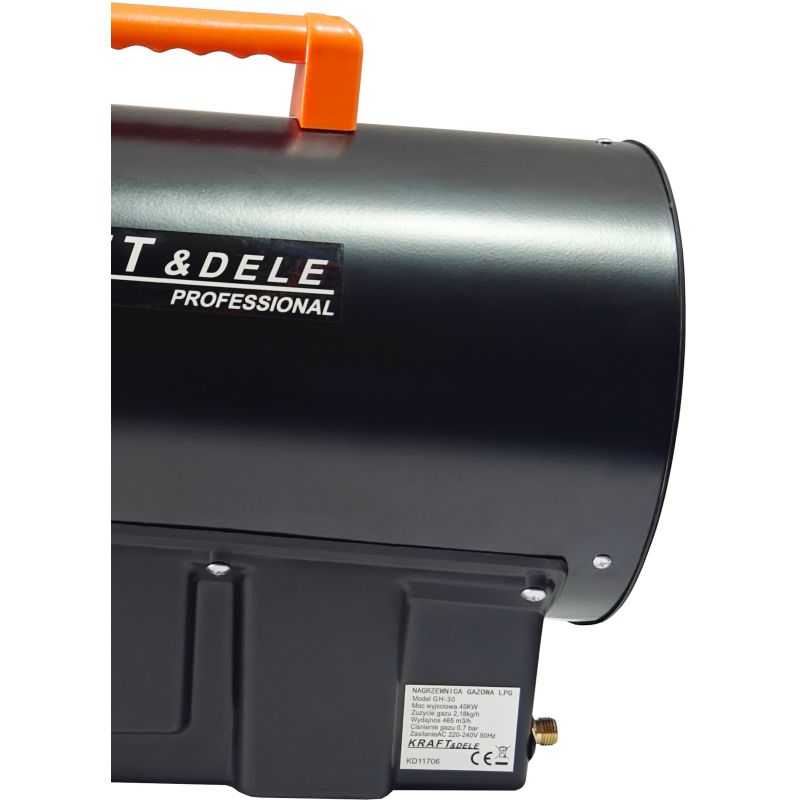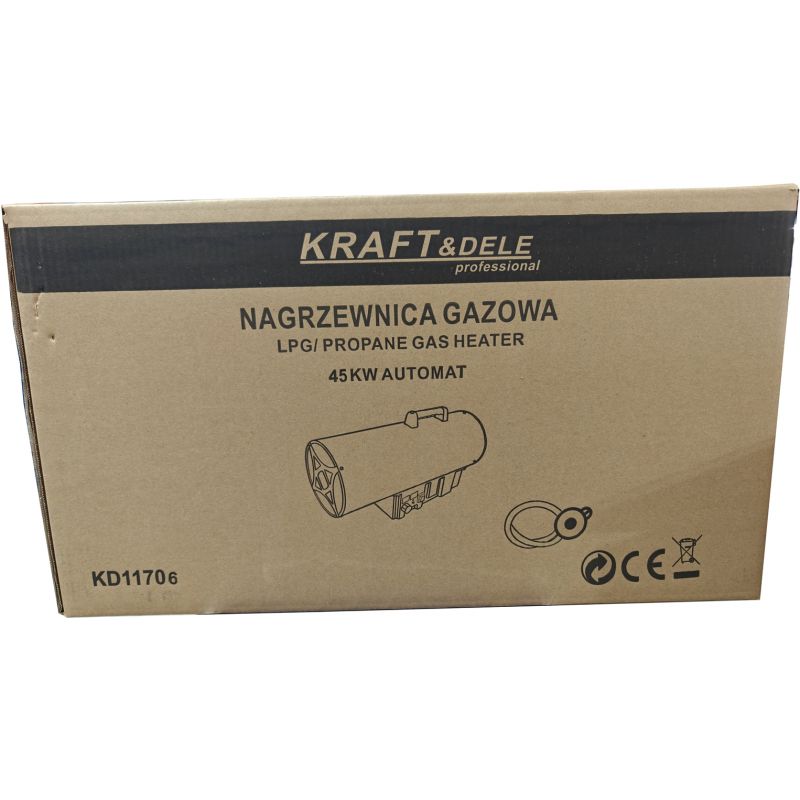 Model KD11701 zasilany jest gazem propan-butan (LPG) i wyposażony w wbudowany termostat z czytelnym wyświetlaczem, który umożliwia precyzyjne ustawienie pożądanej temperatury. Nagrzewnica pracuje automatycznie, dostosowując swoje działanie do zadanej wartości, co przekłada się na komfort użytkowania oraz oszczędną eksploatację. Specjalnie zaprojektowana komora spalania zapewnia wysoką wydajność przy jednoczesnym niskim zużyciu gazu. Urządzenie nie wymaga komina – wystarczy zapewnić odpowiedni dopływ powietrza do prawidłowego spalania. Solidna metalowa obudowa oraz zabezpieczenie termiczne gwarantują bezpieczną i stabilną pracę nawet podczas długotrwałego użytkowania.