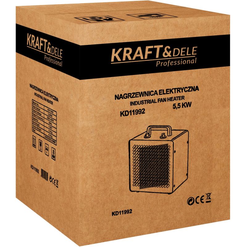 KD11992 to kompaktowa i wydajna nagrzewnica elektryczna marki KRAFT&DELE, przeznaczona do ogrzewania pomieszczeń domowych, warsztatów, magazynów, szklarni oraz placów budowy. Dzięki mocy 5500W urządzenie szybko podnosi temperaturę otoczenia, zapewniając komfort cieplny nawet w chłodniejszych warunkach.