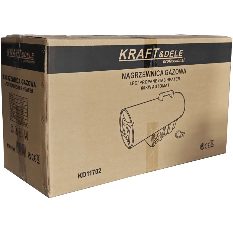 Model KD11702 zasilany jest gazem propan-butan (LPG) i wyposażony w wbudowany termostat z czytelnym wyświetlaczem, który umożliwia precyzyjne ustawienie i kontrolę temperatury otoczenia. Nagrzewnica pracuje automatycznie – włącza się i wyłącza w zależności od ustawionej temperatury, co znacząco poprawia komfort użytkowania oraz pozwala na oszczędną eksploatację. Specjalnie zaprojektowana komora spalania zapewnia bardzo wysoką wydajność cieplną przy niskim zużyciu gazu. Urządzenie nie wymaga komina – wystarczy zapewnić prawidłową wentylację pomieszczenia. Solidna metalowa obudowa oraz zabezpieczenie termiczne gwarantują bezpieczną i stabilną pracę nawet przy długotrwałym użytkowaniu.