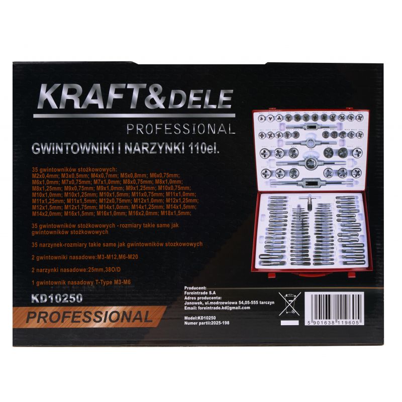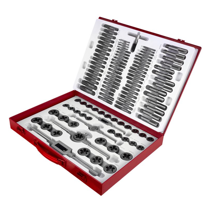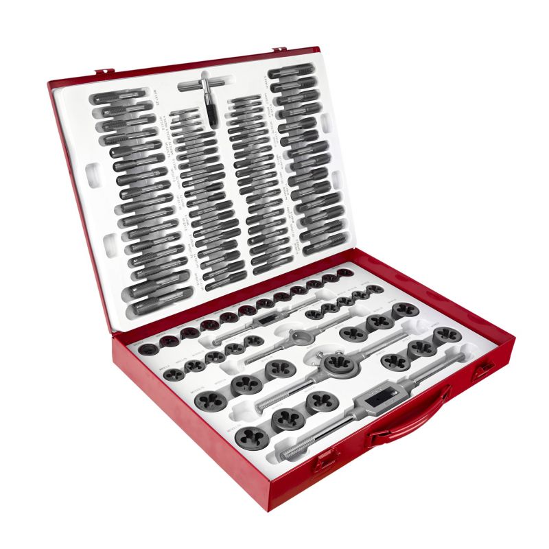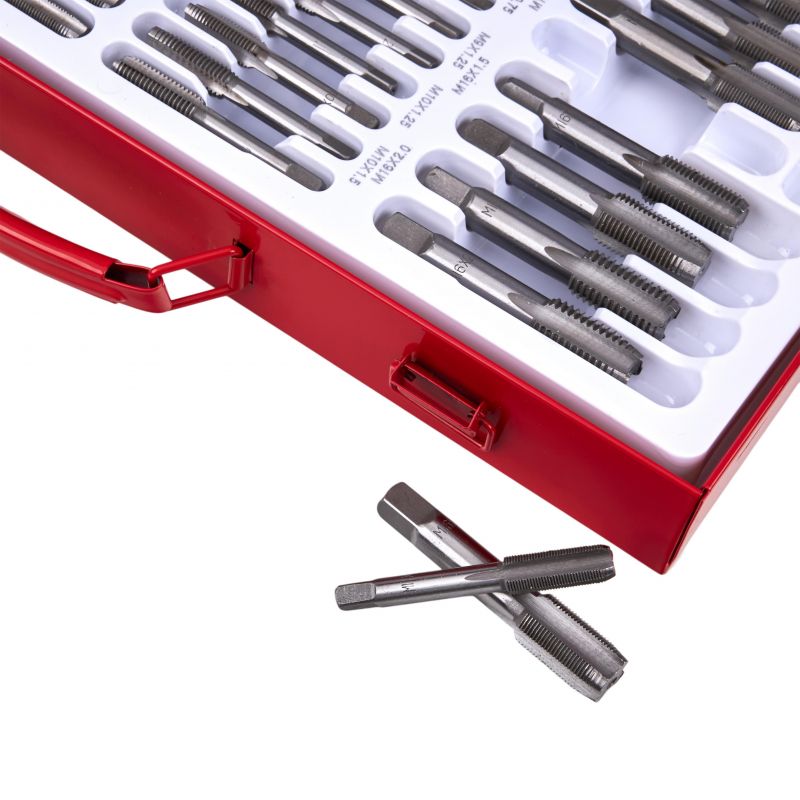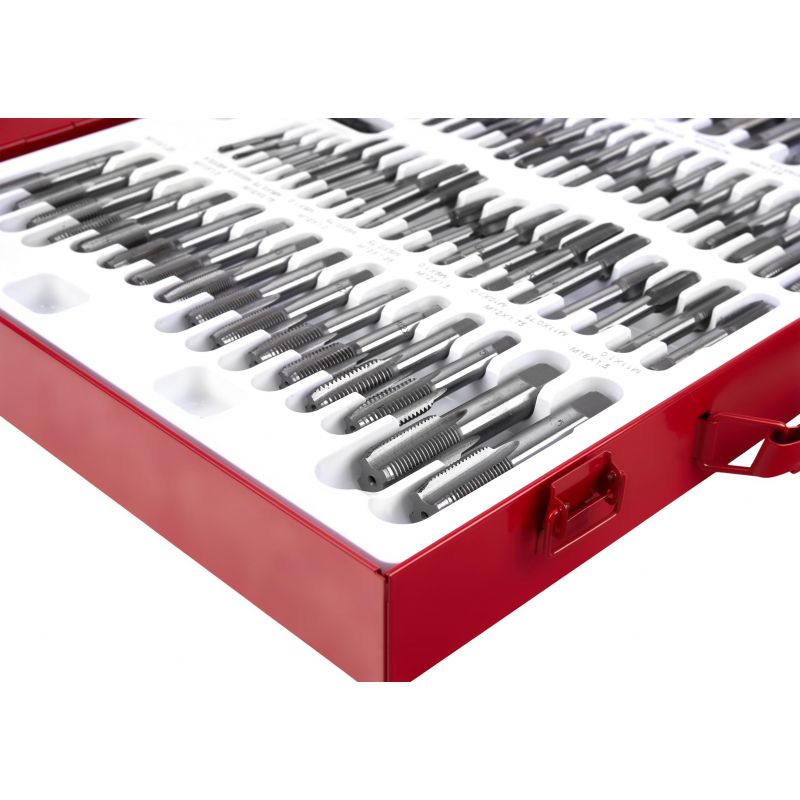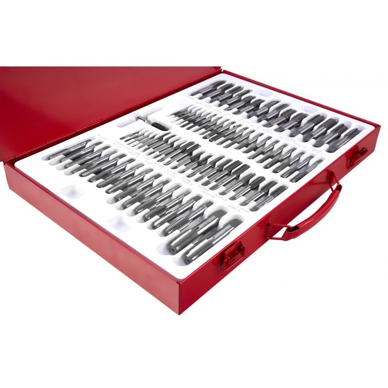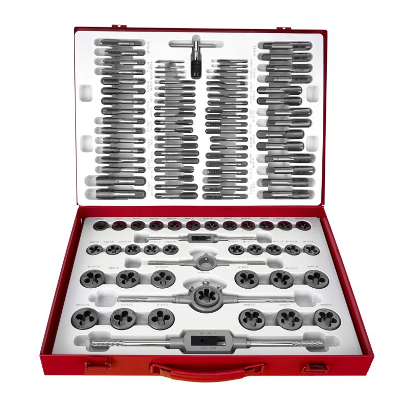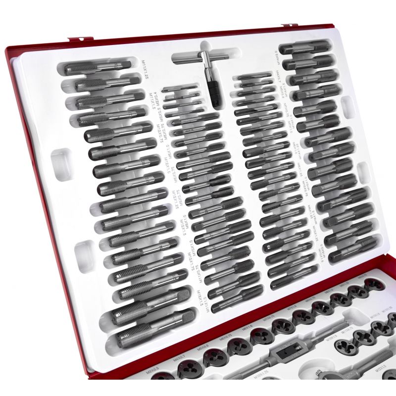 Zestaw 110 gwintowników i narzynek. Wykonane z najwyższej jakości utwardzanej stali, sprawdzi się w każdym warsztacie oraz garażu. Zestaw służy do naprawy połączeń gwintowanych każdego rodzaju w większości materiałów. Dzięki dużej ilości elementów zestaw jest bardzo uniwersalny.