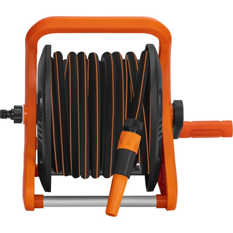 Konstrukcja stojaka zapewnia wysoką stabilność dzięki solidnym rurkom aluminiowym oraz nisko położonemu środkowi ciężkości. Ergonomiczny uchwyt ułatwia przenoszenie, a ręczna korbka umożliwia szybkie i wygodne zwijanie węża po zakończonej pracy. System zwijania zapobiega splątaniu i zaginaniu węża, co przekłada się na jego dłuższą żywotność. Całość została wykonana z materiałów odpornych na warunki atmosferyczne oraz promieniowanie UV, dzięki czemu stojak sprawdzi się podczas regularnego użytkowania w ogrodzie.