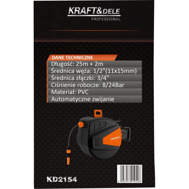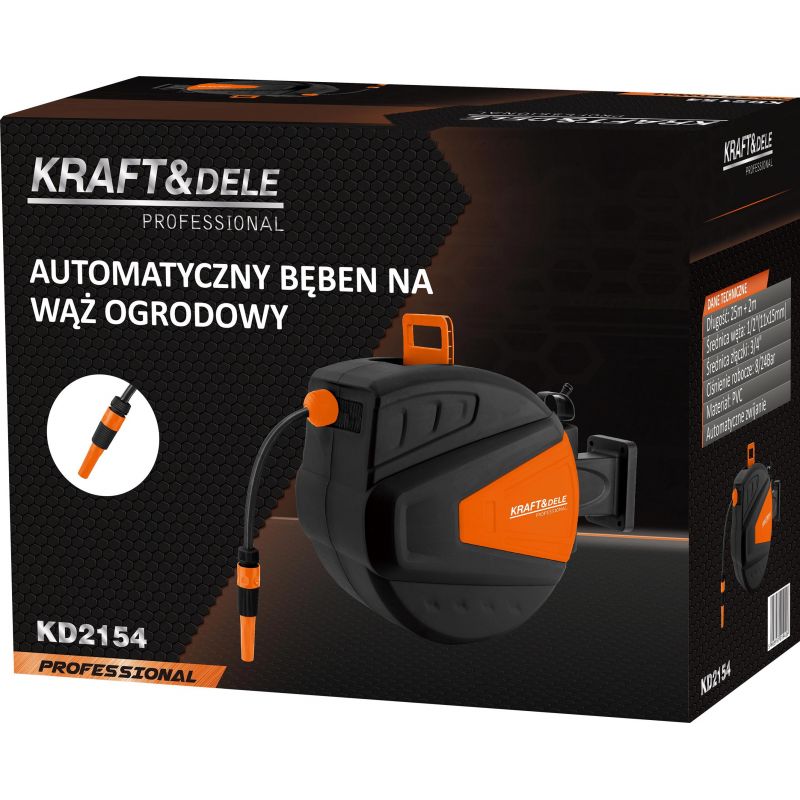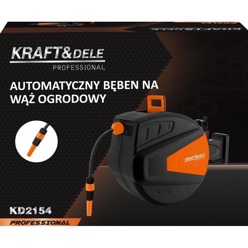KD2154 to funkcjonalny automatyczny bęben na wąż ogrodowy marki KRAFT&DELE, zaprojektowany z myślą o wygodnym i uporządkowanym użytkowaniu w ogrodzie. System automatycznego zwijania umożliwia szybkie schowanie węża bez splątań i załamań, co znacząco poprawia komfort codziennej pracy.