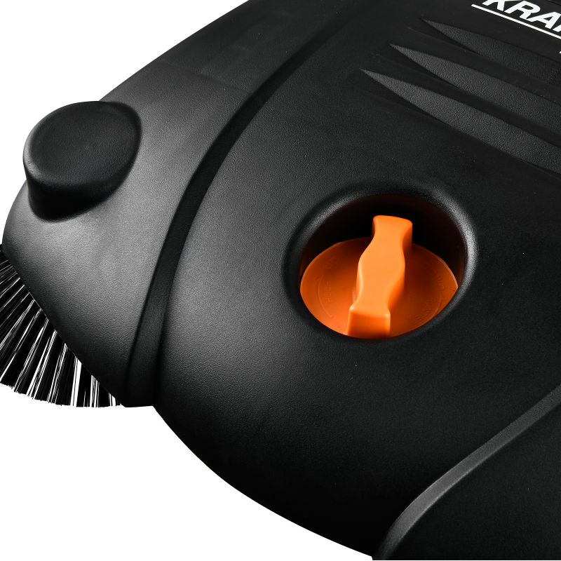 Zamiatarka pracuje w pełni mechanicznie — energię do pracy szczotek pozyskuje z ruchu kół, a zalecana prędkość robocza 5 km/h zapewnia jej maksymalną wydajność. Podwójny system szczotek bocznych oraz centralny moduł zbierający skutecznie usuwają piasek, liście, pył, żwir i inne zanieczyszczenia. Model KD5128 wyposażono także w wygodną regulację wysokości, solidny uchwyt oraz kompaktową konstrukcję, która umożliwia łatwe manewrowanie w wąskich przestrzeniach.