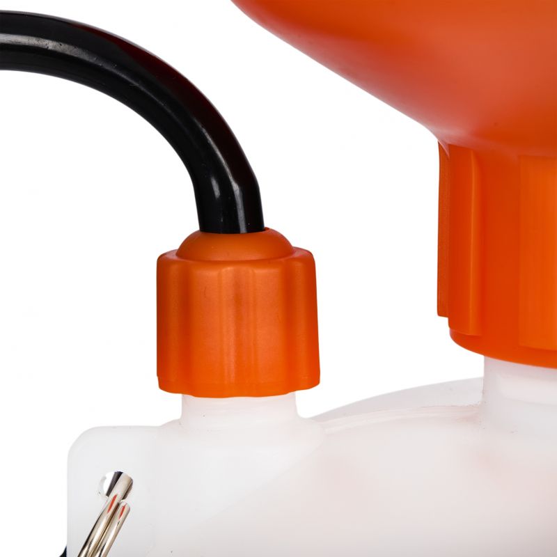 Model KD2034 został wykonany z materiałów odpornych na środki chemiczne, dzięki czemu jest praktyczny w codziennym użytkowaniu i łatwy w utrzymaniu czystości. Ręczna pompa z długim tłokiem przyspiesza proces pompowania i umożliwia sprawne wytworzenie ciśnienia roboczego. Zastosowany zawór bezpieczeństwa zapobiega przekroczeniu dopuszczalnego ciśnienia, a dodatkowo pozwala w prosty sposób zredukować je do poziomu ciśnienia otoczenia przed otwarciem zbiornika. Wygodny, szeroki kielich ułatwia nalewanie cieczy bez rozlewania, stabilna podstawa zapewnia pewne ustawienie, a regulowana lanca 45–80 cm pomaga dopasować zasięg pracy do wysokości roślin i rodzaju aplikacji. Precyzyjna dysza umożliwia płynne przejście od delikatnej mgiełki do skoncentrowanego strumienia, a blokada spustu poprawia ergonomię podczas dłuższych oprysków.