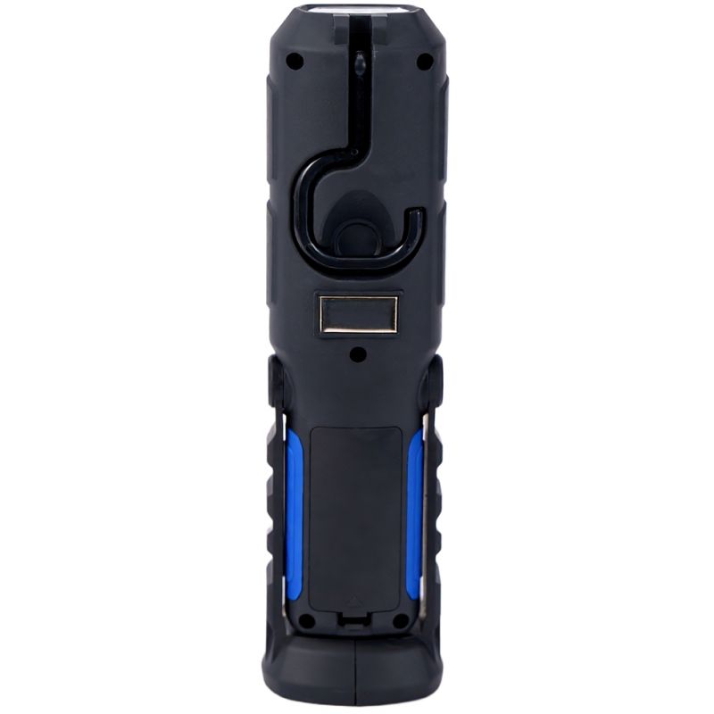 Latarka została wykonana z trwałego tworzywa ABS pokrytego gumą, co zapewnia pewny chwyt, odporność na uszkodzenia mechaniczne oraz komfort użytkowania. Ruchoma podstawa z funkcją regulacji kąta nachylenia umożliwia stabilne ustawienie latarki na dowolnej powierzchni, a obrotowy hak 360° pozwala na zawieszenie jej w dowolnym miejscu. Dodatkowo wbudowany silny magnes umożliwia przymocowanie urządzenia do elementów metalowych – idealne rozwiązanie podczas prac pod samochodem lub przy instalacjach.