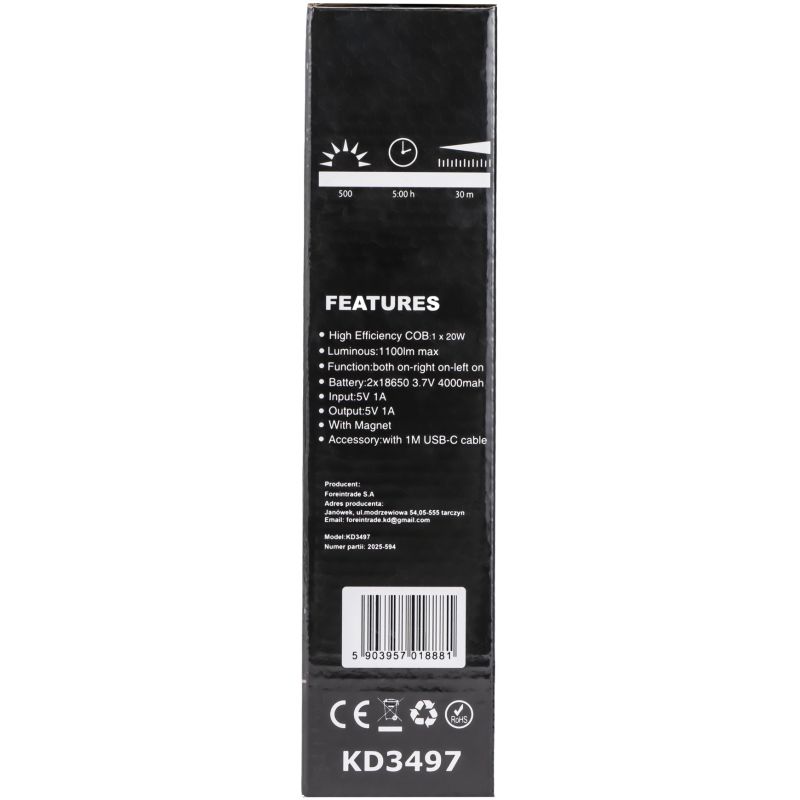 Model KD3497 wyposażony jest w wysokowydajną diodę COB 20W generującą mocne światło o jasności aż 1100 lm. Magnetyczne uchwyty obrotowe oraz obrotowy hak umożliwiają szybkie i stabilne zamocowanie latarki na metalowych powierzchniach lub zawieszenie w dowolnym miejscu. Dodatkowym atutem jest wbudowany gwint 1/4-20, pozwalający na montaż na statywie.