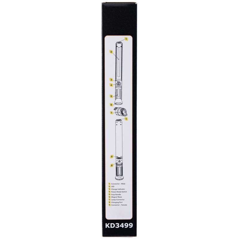 Swobodnie obracane uchwyty, magnetyczna podstawa oraz możliwość pracy każdej części jako osobnej lampy sprawiają, że KD3499 idealnie nadaje się do warsztatów, serwisów samochodowych, prac instalacyjnych czy użytku domowego. Jasne, zimne światło 6500K oraz tryby 100% i 50% zapewniają idealne dopasowanie do rodzaju pracy, a zasilanie poprzez USB-C pozwala wygodnie ładować latarkę.