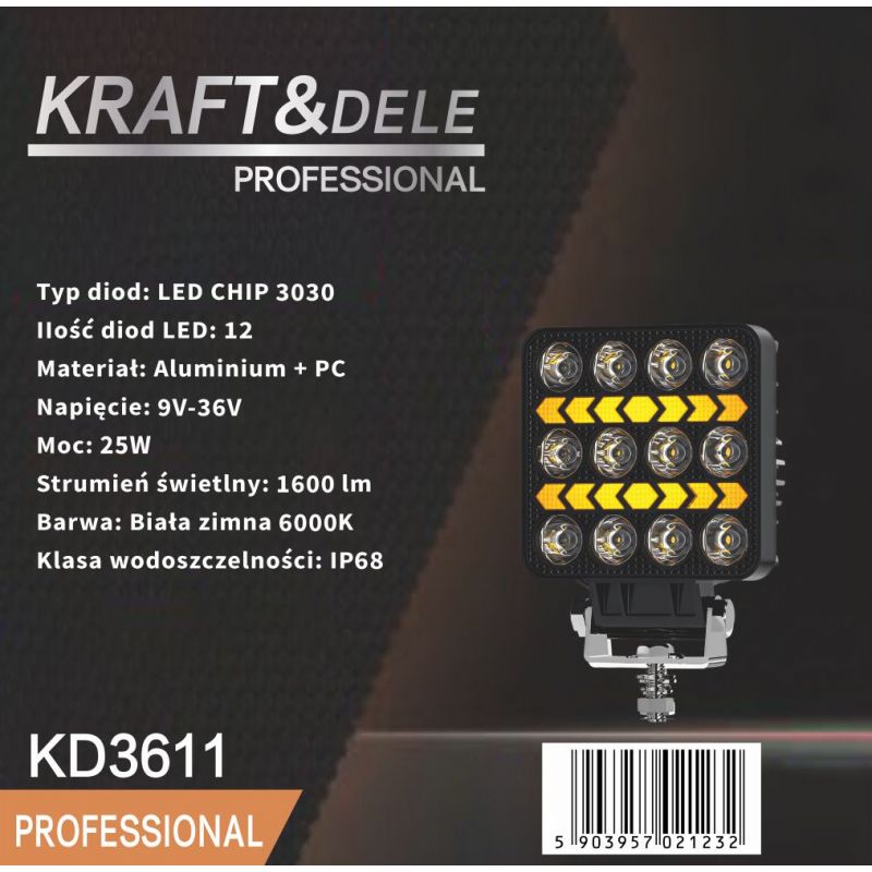 KD3611 to wydajne źródło światła zaprojektowane z myślą o pracy w wymagających warunkach. Dzięki zastosowaniu nowoczesnych diod LED typu CHIP 3030 oraz strumieniowi świetlnemu na poziomie 1600 lumenów, zapewnia bardzo dobre i równomierne oświetlenie przestrzeni roboczej, pojazdów, maszyn czy terenu wokół nich.