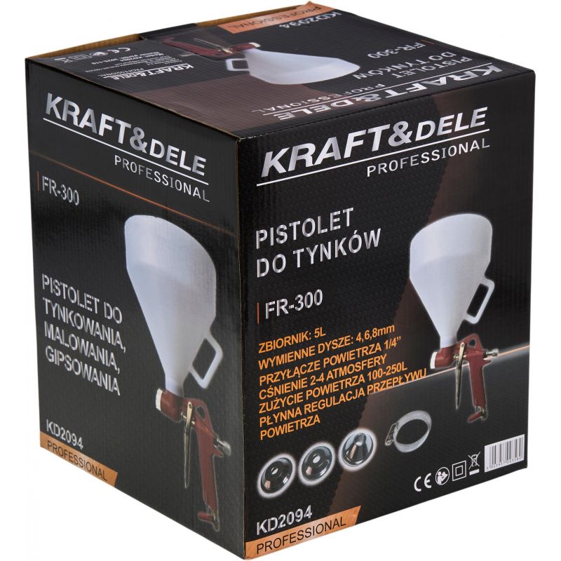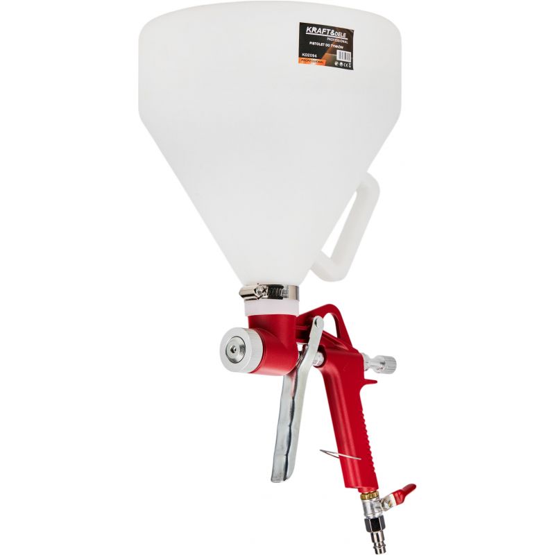 Model KD2094 został wykonany z lekkiego i wytrzymałego stopu aluminium, co znacząco poprawia komfort pracy nawet podczas dłuższego użytkowania. Zbiornik o pojemności 5 litrów pozwala na sprawną pracę bez częstego uzupełniania materiału, a wymienne dysze umożliwiają dopasowanie strumienia natrysku do rodzaju używanego materiału. Pistolet posiada płynną regulację przepływu powietrza, co pozwala na precyzyjne ustawienie parametrów pracy i uzyskanie oczekiwanego efektu wykończenia.
