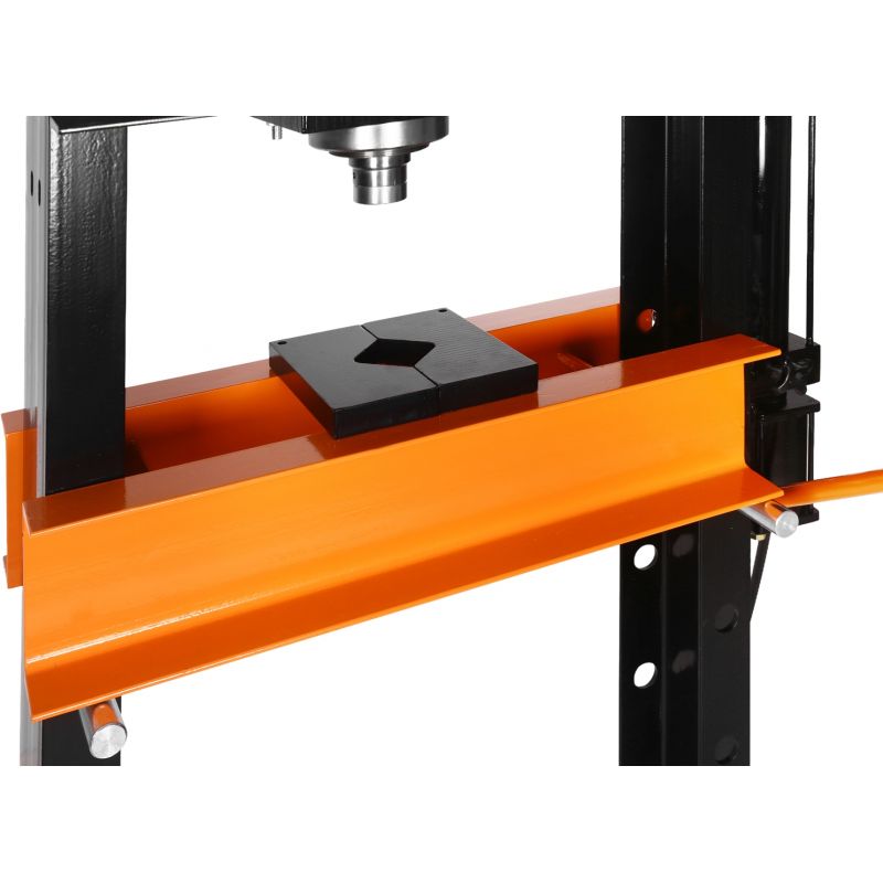 Regulowana półka robocza z 8-stopniową zmianą wysokości pozwala na szybkie dostosowanie przestrzeni roboczej do aktualnych potrzeb. Duży skok tłoka oraz nacisk 30 ton sprawiają, że prasa doskonale sprawdza się podczas prasowania, prostowania oraz osadzania elementów wymagających dużej siły. W komplecie znajdują się także 2 żeliwne płyty, które zwiększają funkcjonalność urządzenia podczas codziennej pracy.