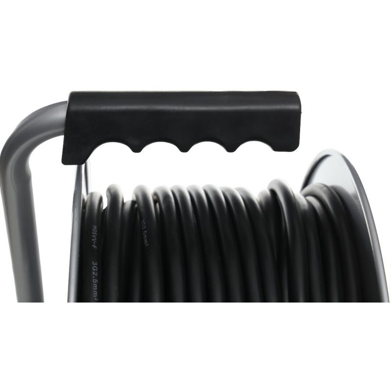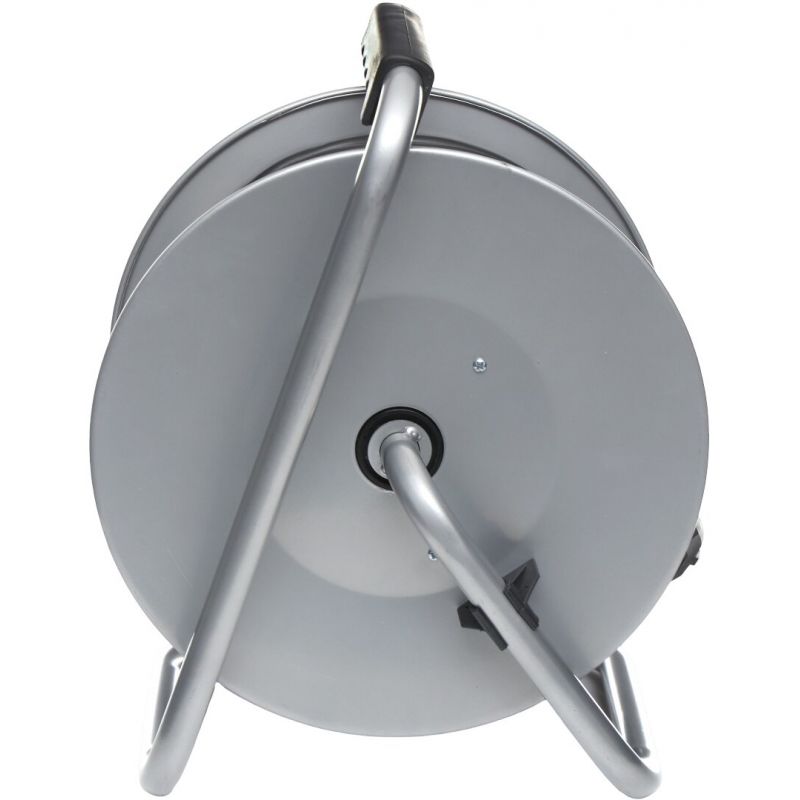 Bęben wykonany z wytrzymałego metalu oraz stalowy stojak zapewniają stabilność i odporność na typowe warunki ogrodowe. Wygodny uchwyt ułatwia transport oraz przenoszenie przedłużacza, a konstrukcja umożliwia szybkie zwijanie i przechowywanie przewodu po zakończeniu pracy.