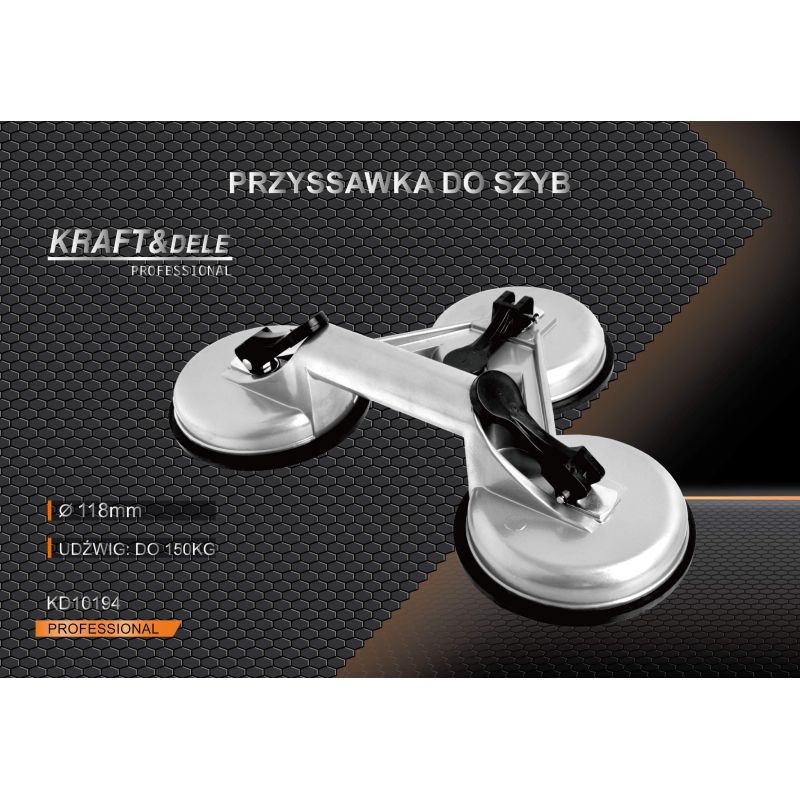 Model KD10194 wyposażony jest w trzy mocne przyssawki o średnicy 118 mm oraz wygodny system zacisku mimośrodowego, który zapewnia szybkie i stabilne przymocowanie uchwytu do powierzchni. Aluminiowy korpus gwarantuje trwałość i odporność na uszkodzenia, natomiast gumowe przyssawki zapewniają mocny chwyt i bezpieczeństwo podczas pracy. Dzięki maksymalnemu udźwigowi do 150 kg uchwyt sprawdzi się zarówno w profesjonalnych zastosowaniach montażowych, jak i podczas prac warsztatowych czy remontowych.