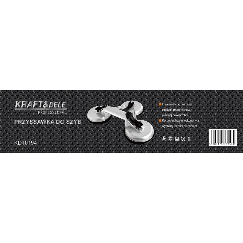 KD10194 to solidna przyssawka transportowa marki KRAFT&DELE, przeznaczona do bezpiecznego przenoszenia elementów o gładkiej powierzchni takich jak szyby, okna, szyby samochodowe, arkusze blach, panele, laminaty oraz inne podobne materiały. Narzędzie zostało zaprojektowane z myślą o wygodnym i pewnym chwycie, który ułatwia transport dużych oraz ciężkich elementów.