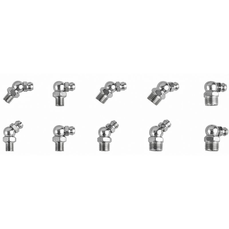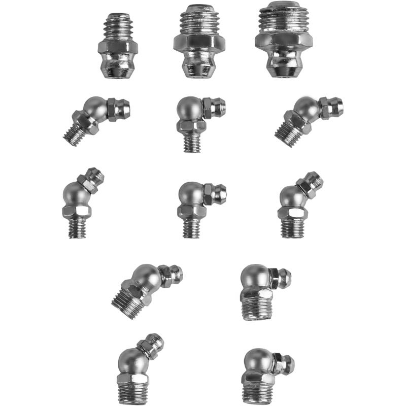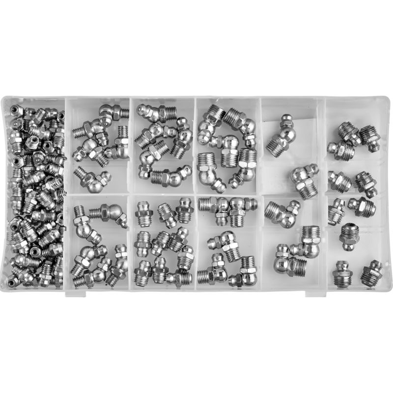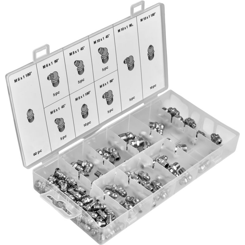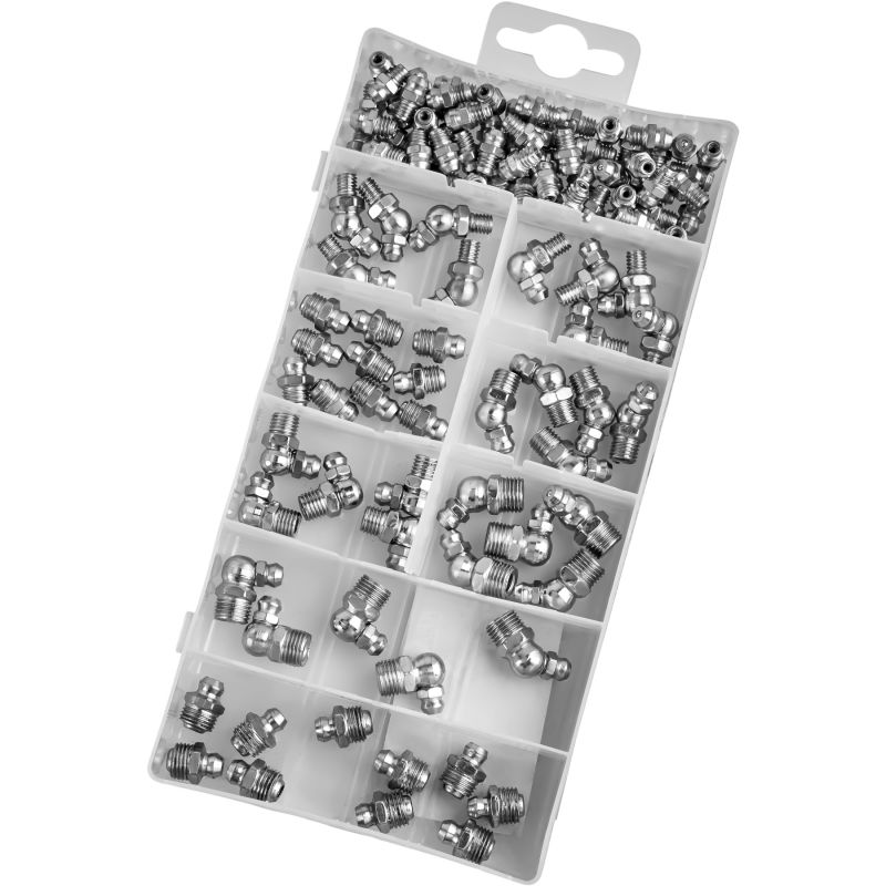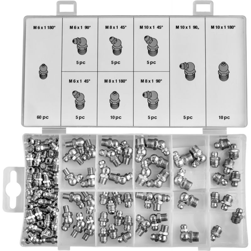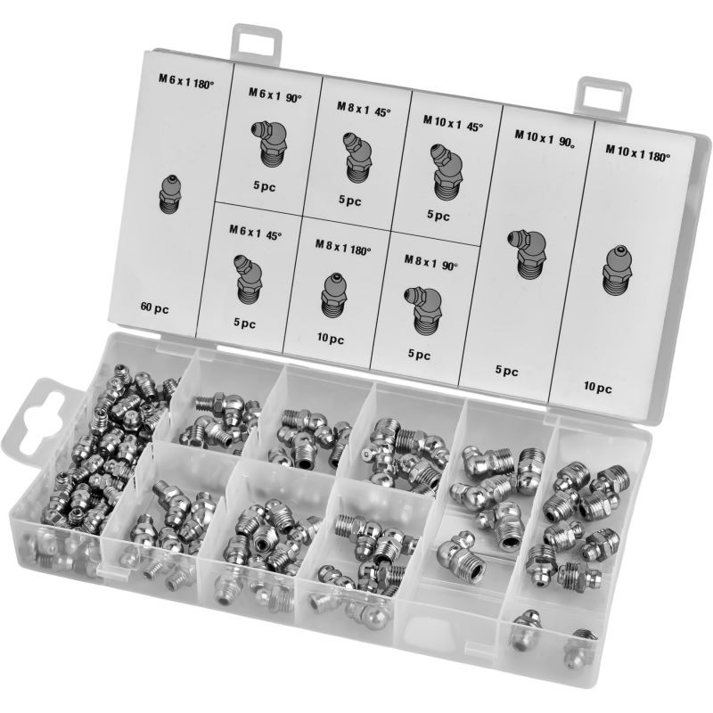 W skład zestawu wchodzą smarowniczki proste, pod kątem 45° oraz 90°, umożliwiające wygodny dostęp do trudno umiejscowionych punktów smarnych. Gwinty w rozmiarach M6, M8 oraz M10 zapewniają szeroką kompatybilność z popularnymi urządzeniami i podzespołami mechanicznymi. Wszystkie elementy zostały zapakowane w praktyczne pudełko z przegródkami i opisami, co ułatwia organizację oraz szybkie odnalezienie właściwej smarowniczki.
