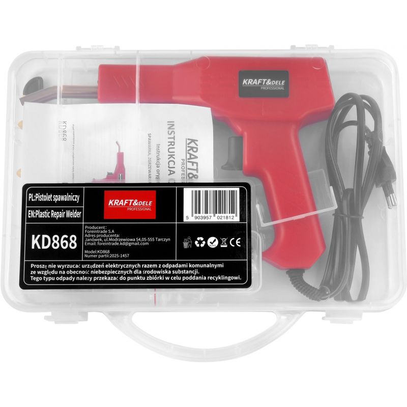 KD868 to uniwersalna spawarka do plastiku marki KRAFT&DELE, przeznaczona do naprawy i łączenia elementów z tworzyw sztucznych. Urządzenie znajduje szerokie zastosowanie zarówno w gospodarstwie domowym, jak i w warsztatach – szczególnie przy naprawie elementów samochodowych, takich jak zderzaki czy deski rozdzielcze.
