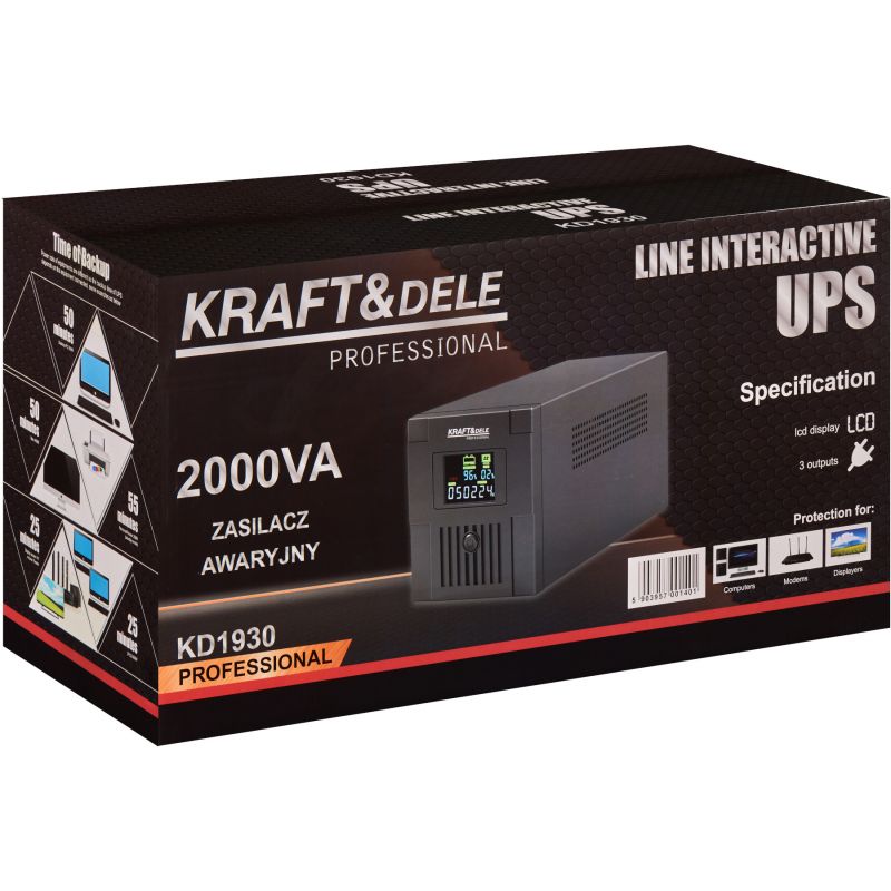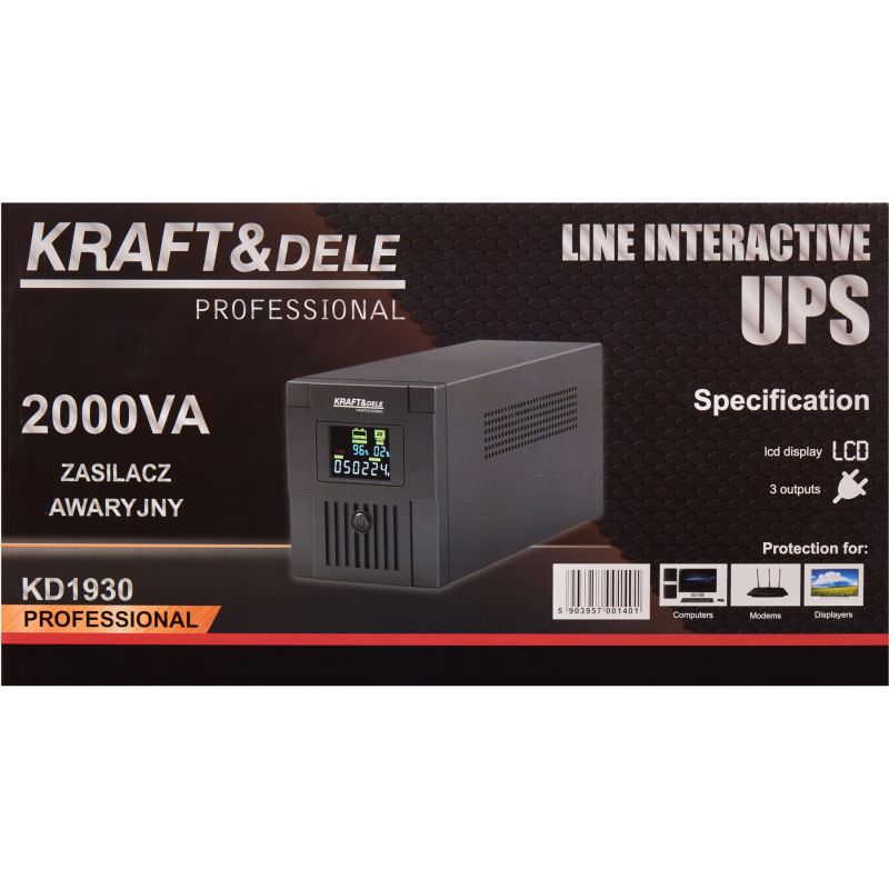 Zasilacz UPS KD1930 wyposażony został w czytelny wyświetlacz LCD, który umożliwia bieżące monitorowanie parametrów pracy takich jak napięcie wejściowe i wyjściowe, poziom obciążenia oraz stan baterii. Dzięki pojemności 2000VA oraz mocy 1200W urządzenie doskonale sprawdzi się do zasilania komputerów, serwerów, systemów alarmowych, kas fiskalnych oraz sprzętu RTV. Automatyczna regulacja napięcia AVR oraz szybki czas przełączania zapewniają stabilną i niezawodną pracę podłączonych urządzeń.
