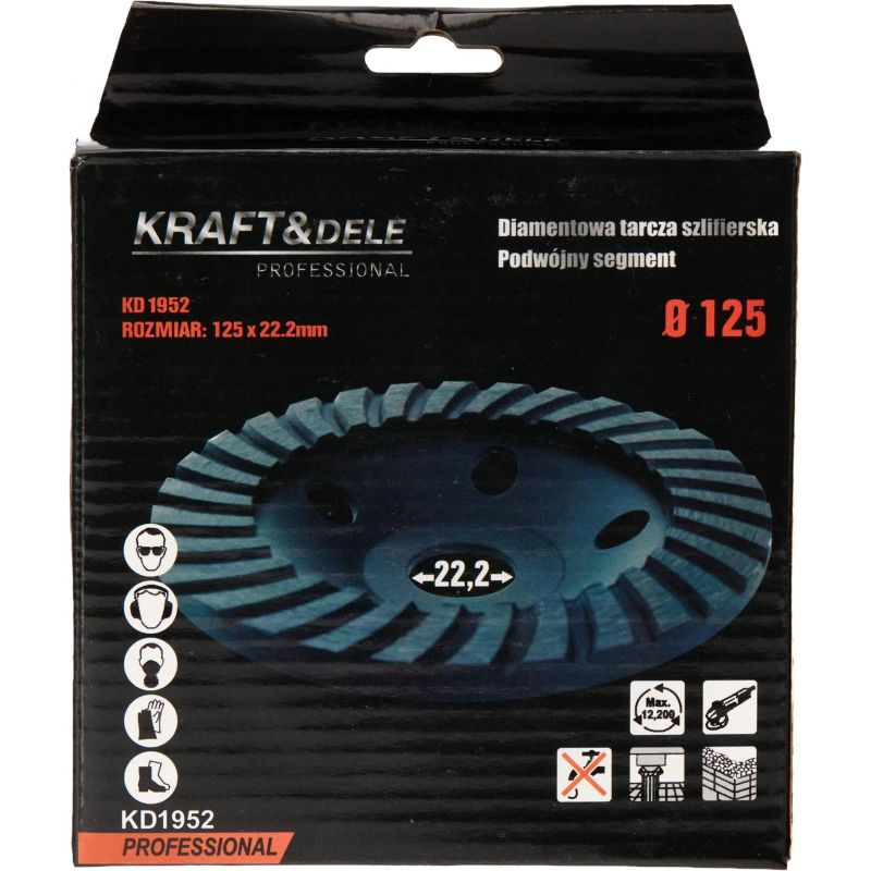 Diamentowa tarcza szlifierska KD1952 marki KRAFT&DELE przeznaczona jest do intensywnego szlifowania oraz wyrównywania powierzchni betonowych i mineralnych. Dzięki solidnej konstrukcji oraz segmentowi typu TURBO umożliwia skuteczne usuwanie nierówności, zanieczyszczeń oraz nadlewek z różnego rodzaju podłoży.