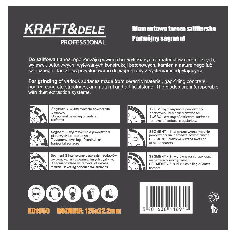KD1950 to diamentowa tarcza szlifierska marki KRAFT&DELE, przeznaczona do obróbki różnego rodzaju powierzchni wykonanych z materiałów ceramicznych, betonu, kamienia naturalnego i sztucznego oraz innych twardych materiałów budowlanych. Dzięki solidnej konstrukcji i podwójnemu segmentowi tarcza sprawdza się podczas wyrównywania powierzchni, usuwania nadlewów, nierówności oraz zanieczyszczeń.