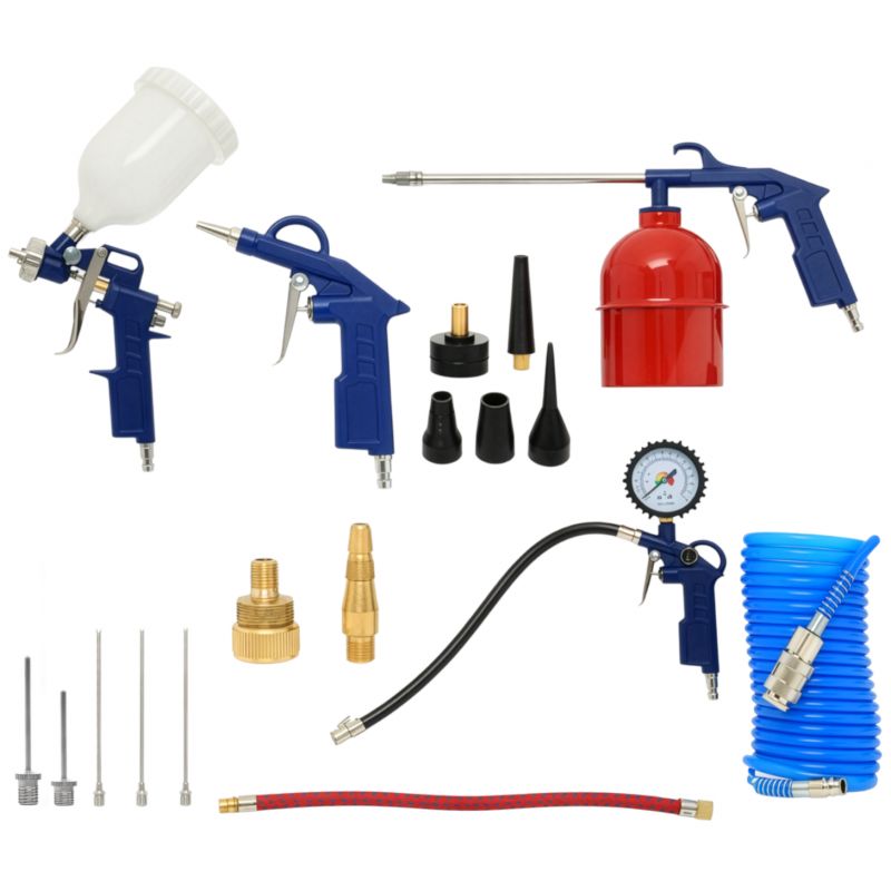 zestaw lakierniczy 18 el; zestaw pneumatyczny do kompresora; komplet pistoletów pneumatycznych; zestaw do malowania i pompowania; akcesoria do kompresora; pistolet do przedmuchiwania; wąż spiralny 5m; zestaw do pompowania kół;