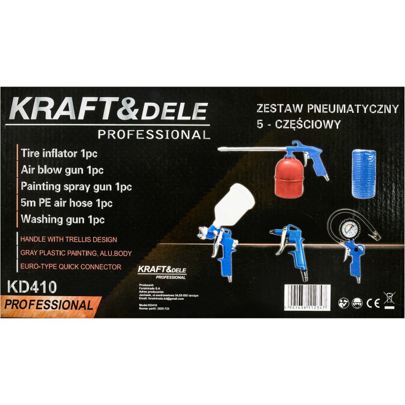 KD410 to kompletny zestaw pneumatyczny marki KRAFT&DELE, przeznaczony do szerokiego zakresu prac warsztatowych, serwisowych oraz hobbystycznych. W jego skład wchodzi aż pięć funkcjonalnych narzędzi, dzięki którym można wykonywać malowanie, czyszczenie, pompowanie, przedmuchiwanie oraz podłączanie urządzeń pneumatycznych. Zestaw idealnie sprawdzi się zarówno w profesjonalnym warsztacie, jak i przy domowych pracach.
