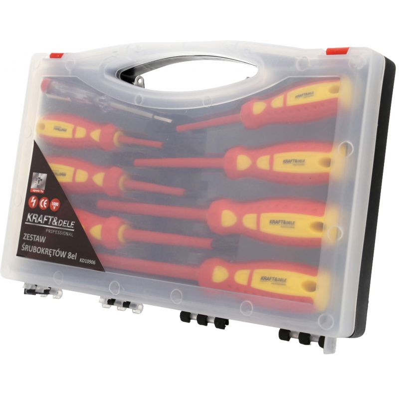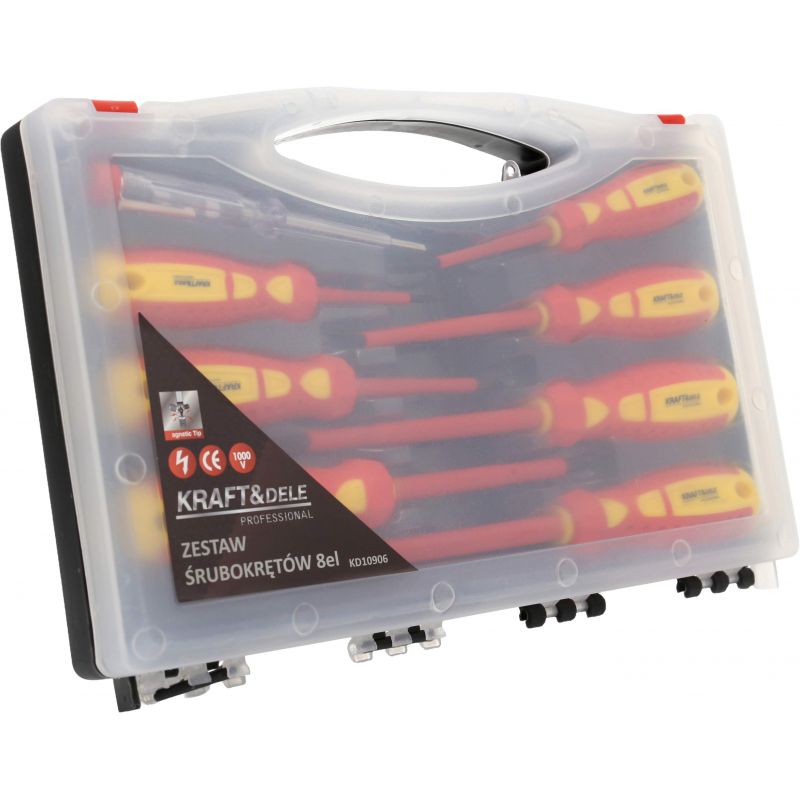 W zestawie znajdują się najczęściej używane wkrętaki płaskie i krzyżowe, a także próbnik napięcia, który zwiększa funkcjonalność kompletu. Ergonomiczne rękojeści zapewniają pewny chwyt i komfort pracy, a zastosowanie wysokiej jakości materiałów wpływa na długą żywotność narzędzi. Dodatkowo śrubokręty wyposażone są w magnetyczne końcówki, które ułatwiają przytrzymanie śrub podczas pracy. Całość została zapakowana w praktyczną walizkę, która ułatwia przechowywanie oraz transport.