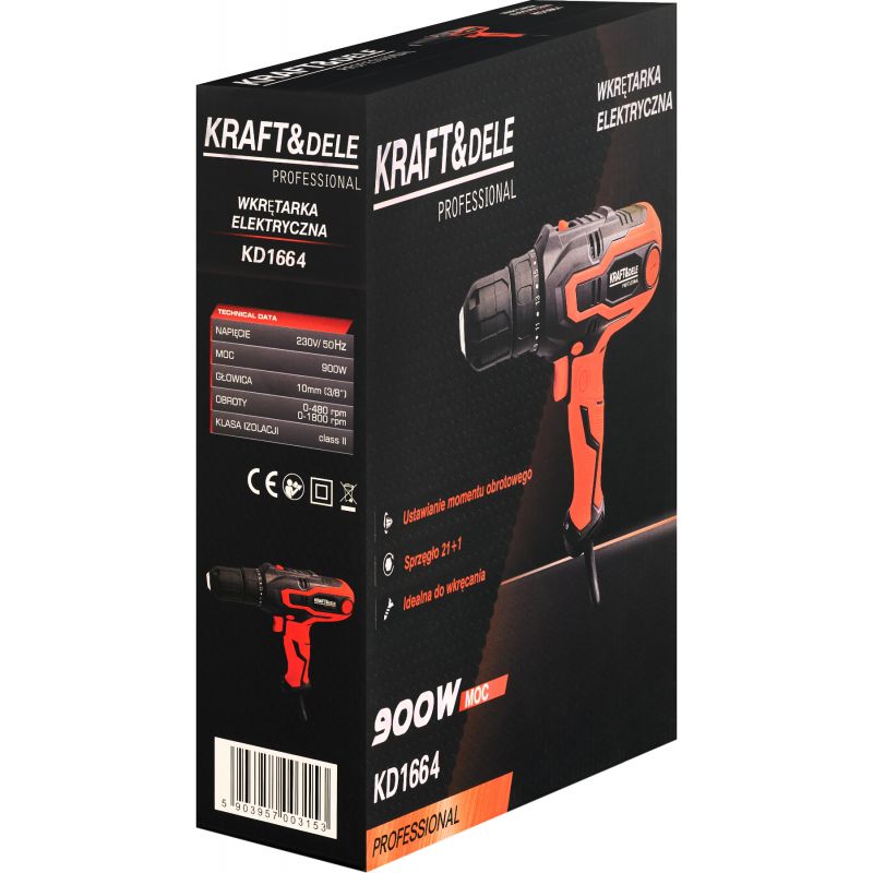 Wkrętarka KD1664 marki KRAFT&DELE to niezawodne narzędzie, które sprawdzi się zarówno w domu, warsztacie, jak i w profesjonalnej firmie. Urządzenie sieciowe o mocy 900W umożliwia wydajną i bezpieczną pracę bez potrzeby ładowania akumulatorów.