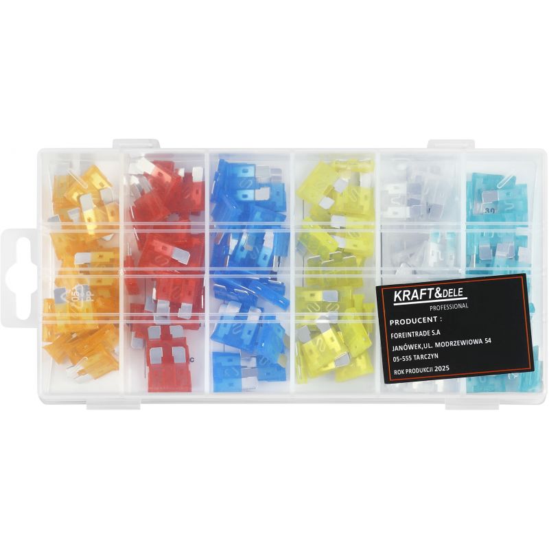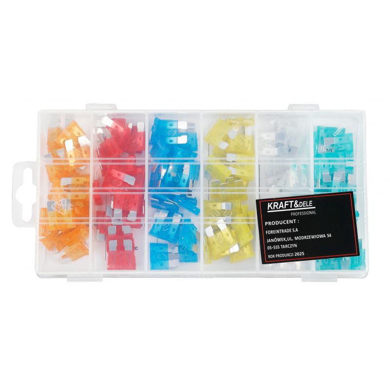 W komplecie znajduje się 120 sztuk bezpieczników o różnych wartościach prądowych, co pozwala na natychmiastową wymianę uszkodzonego bezpiecznika niezależnie od zapotrzebowania. Całość zapakowana jest w solidne i przejrzyste pudełko, które ułatwia segregację elementów.