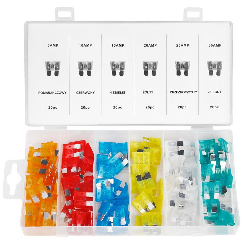 ✅ Zestaw zawiera po 20 sztuk bezpieczników z każdej wartości
